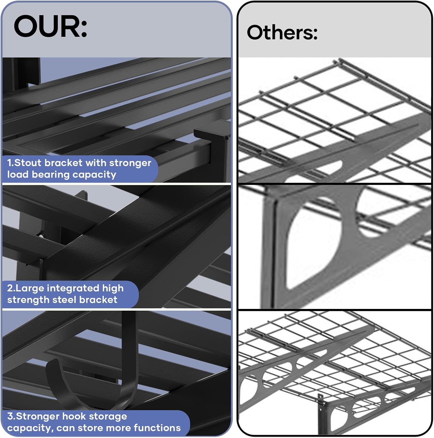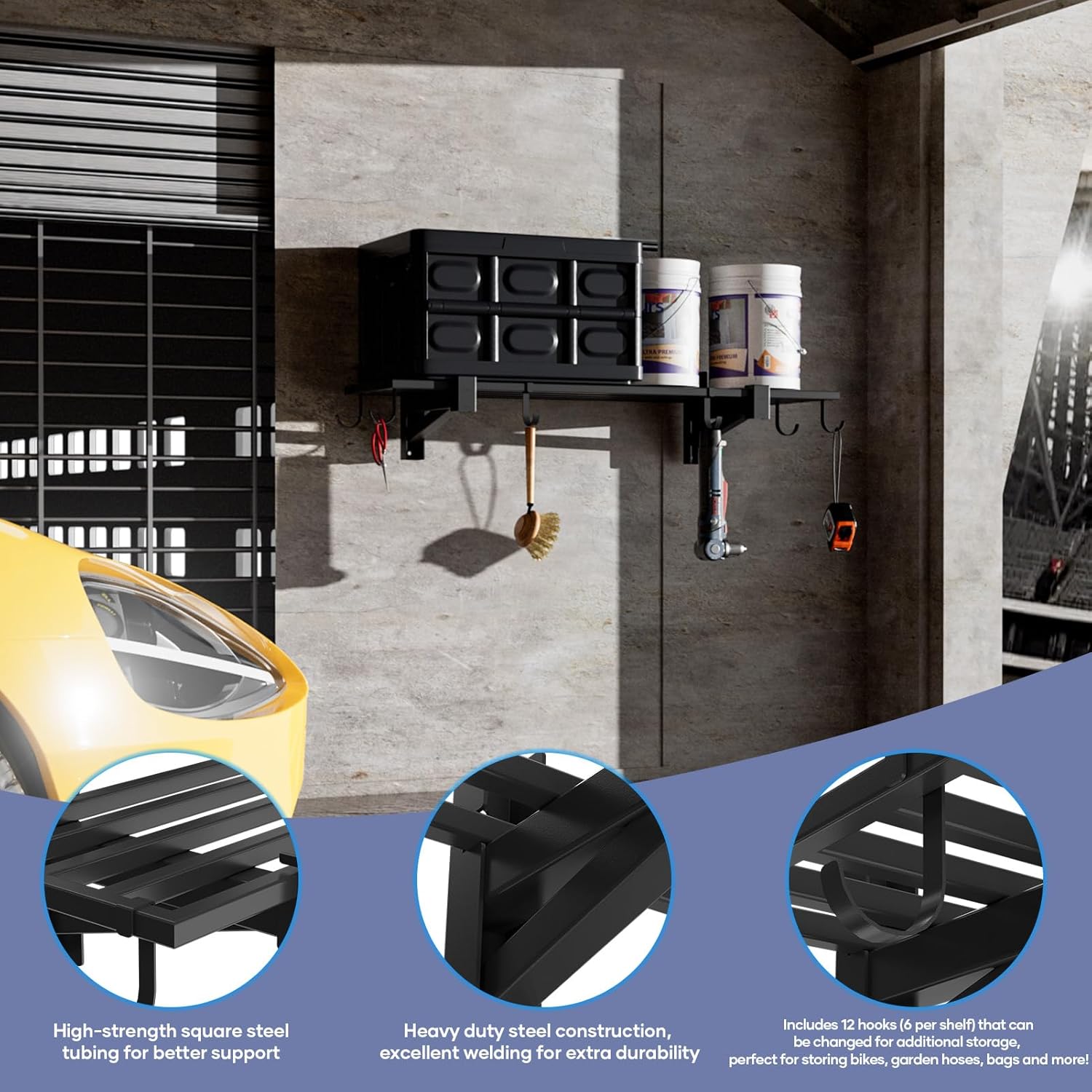 - Multiple storage functions: each garage wall mount shelf provides six hooks, which can maximize the storage function of the shelf to meet a variety of storage needs, while keeping the environment neat and tidy