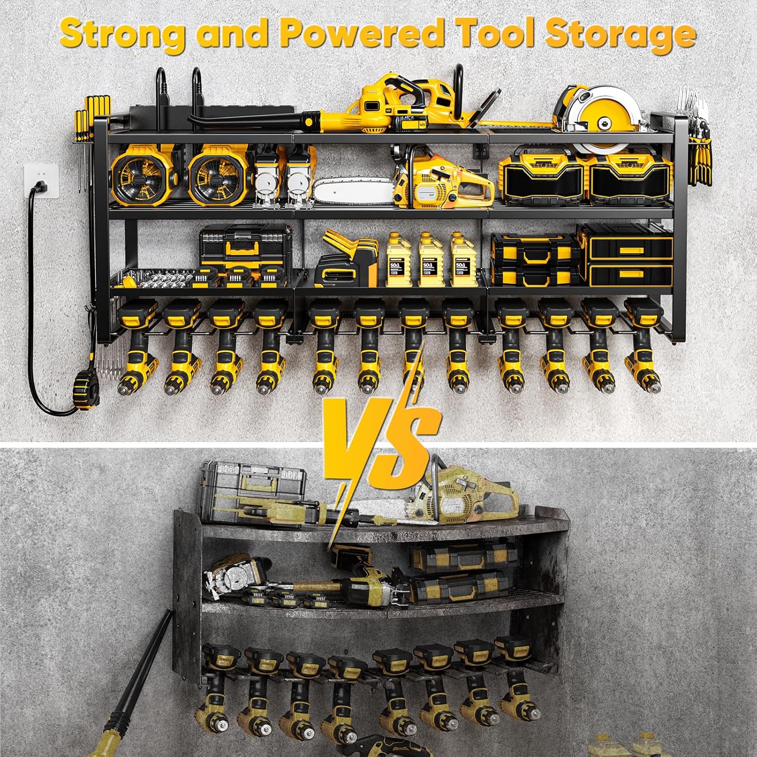 - Built-In 8-Outlet Charging Station: Stay powered up with the integrated tool rack featuring an 8-outlet power strip with 1200J surge protection and a 6.56-foot cord. This cordless tool organizer lets you charge multiple battery packs simultaneously, maximizing your garage workflow efficiency.