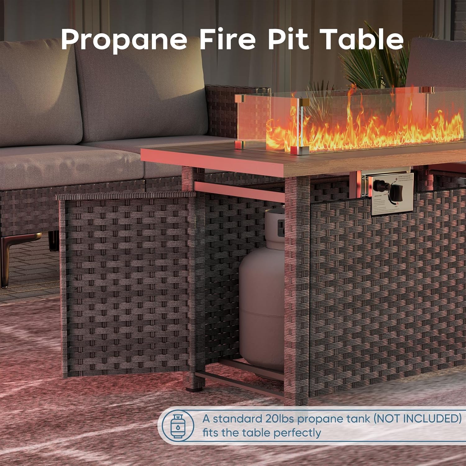 Propane Fire Pit Table Outdoor, 44" 60000BTU Auto-Ignition Fire Pits Table with Wind Guard Square Large Wicker Propane Firepits for Porch Garden(Grey,CSA Certified)