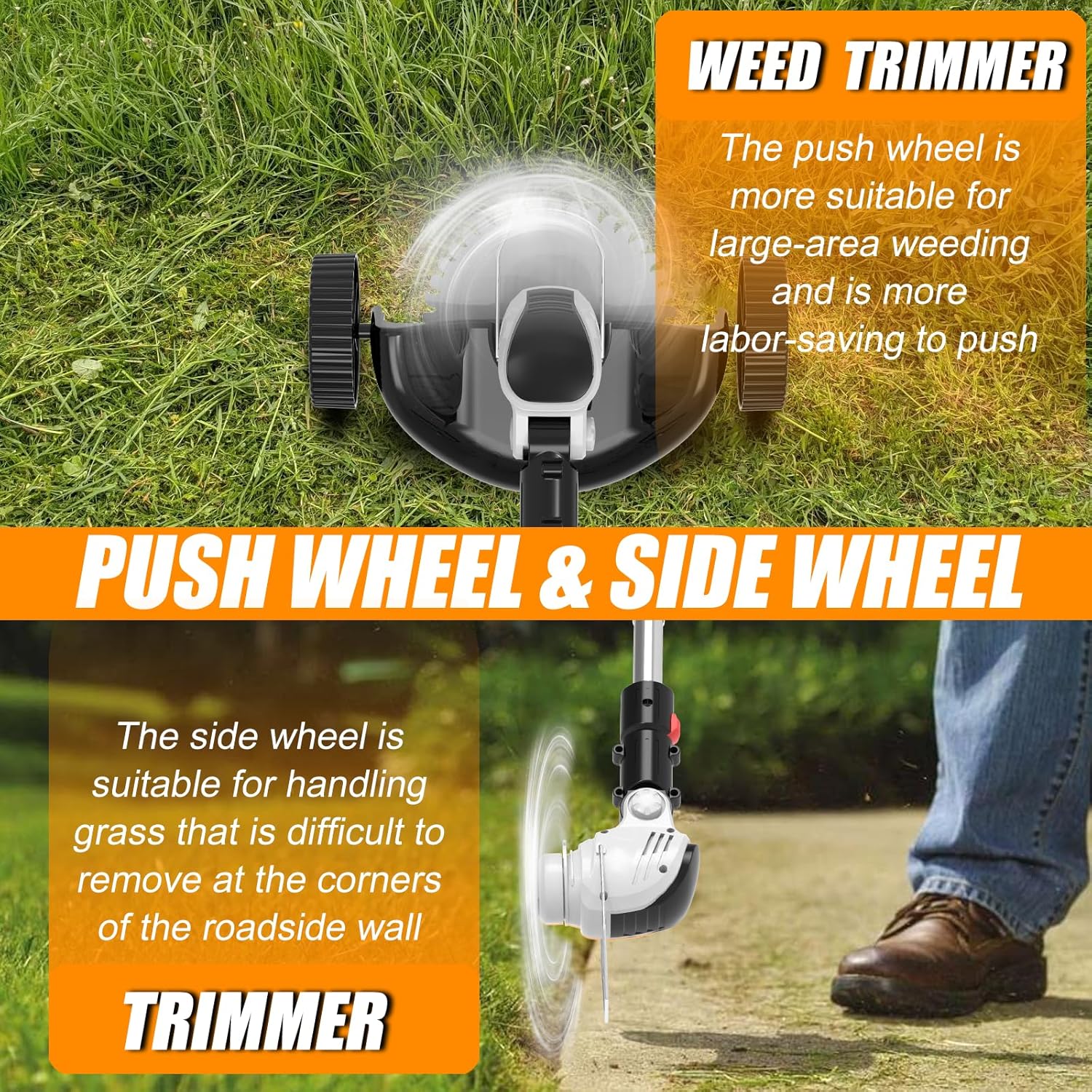 - 【Upgraded Electric Weed Wacker】 Our weed wacker battery operated has passed the professional design and safety test. The weed trimmer has been upgraded with smoother wheels, a larger mowing area, higher-strength blades and larger-capacity batteries. We have completely solved the problems of the old string trimmer, such as wheels failing to turn, blade breakage and short cutting time. 2 modes (wheel on/wheel off) can be switched freely, allowing you to mow your garden and yard lawn more easily