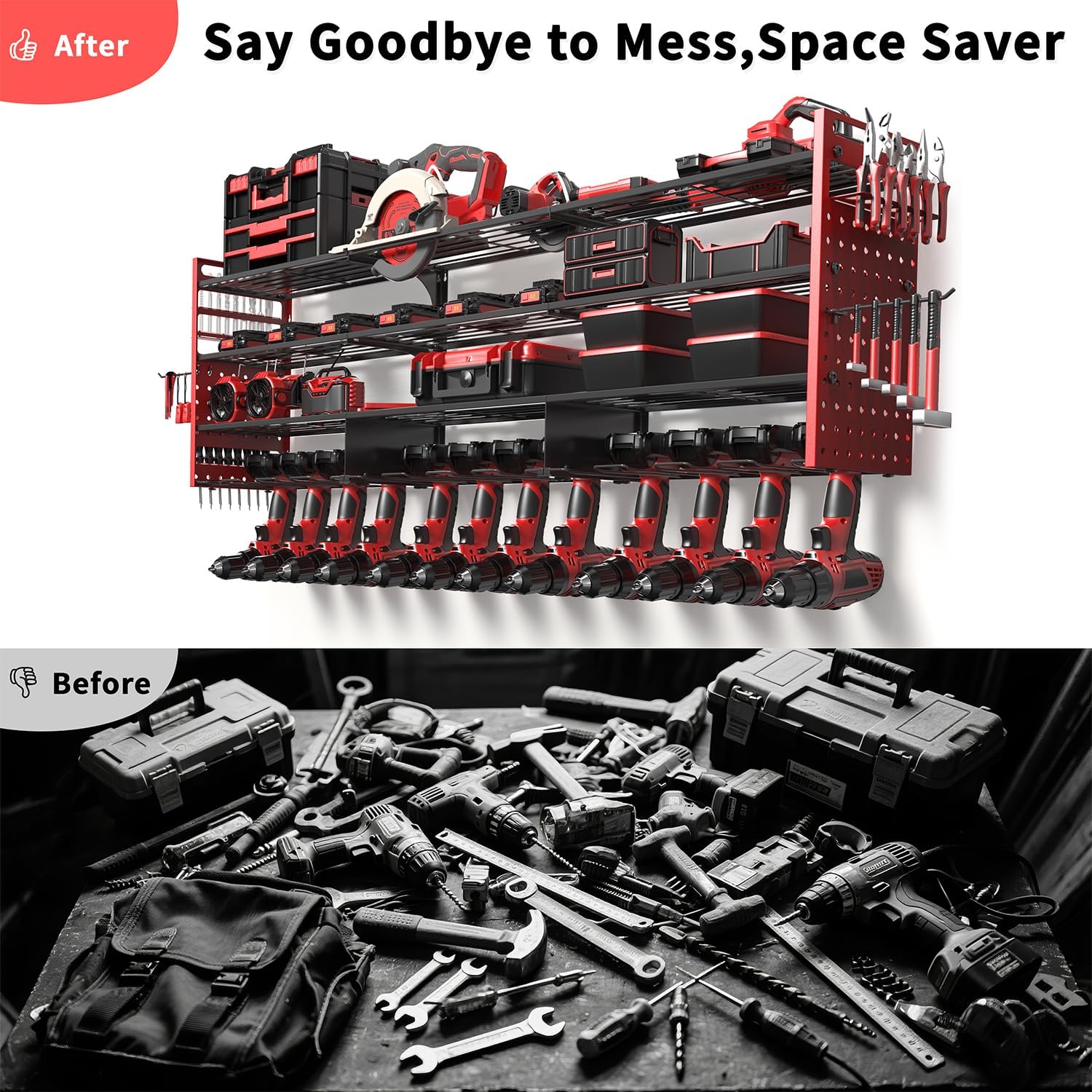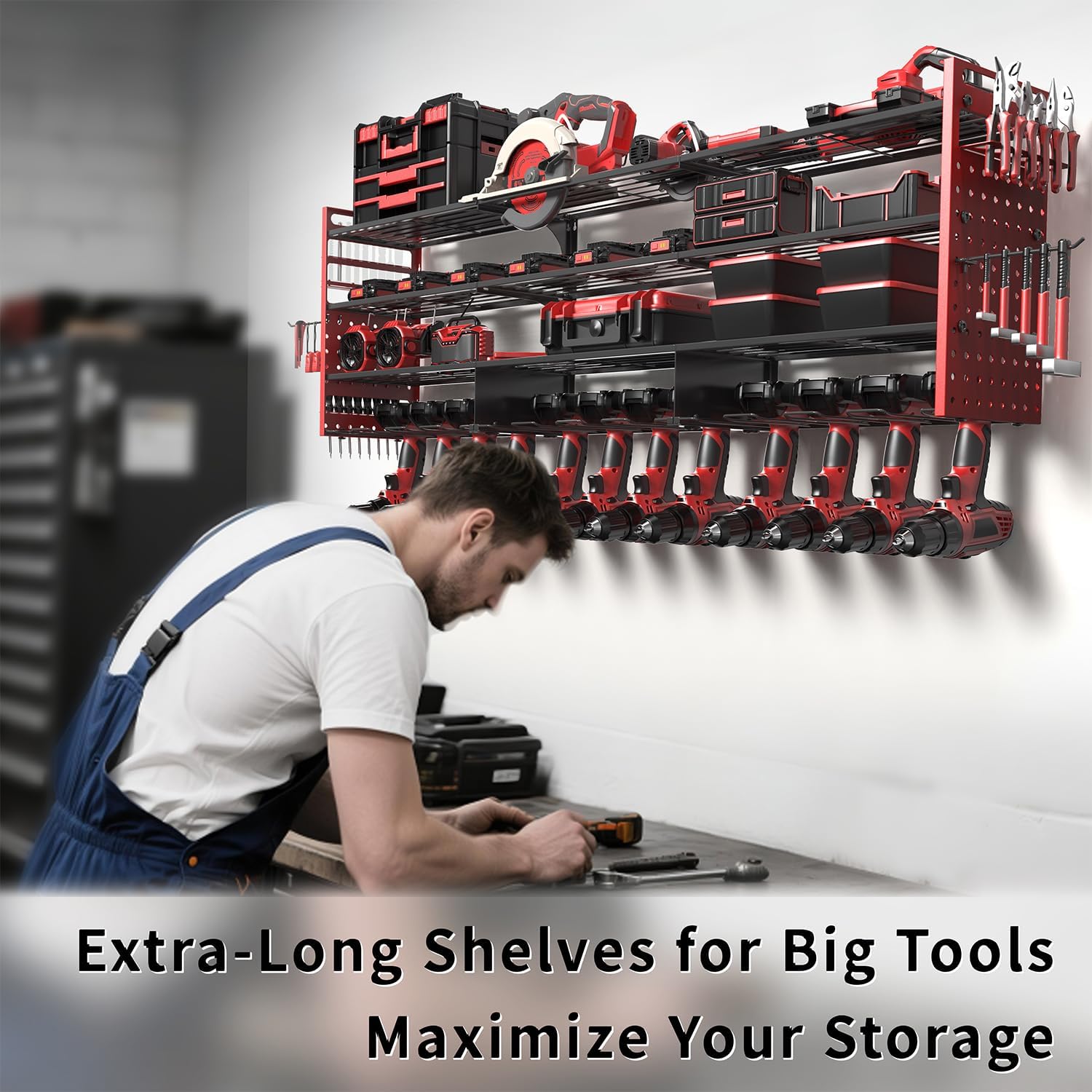 - 💪【 52.4" 4-Tier Power Tool Organizer Storage with 12 Cordless Drills Rack】 This power tool organizer wall mount features a 4-tier structure with a total length of 52.4 inches. Store up to 12 Cordless Drills on the bottom tier, with spacious compartments above for batteries, toolboxes, hammers, angle grinders, heat guns, and more. Ideal for keeping every tool within reach and your garage clutter-free.