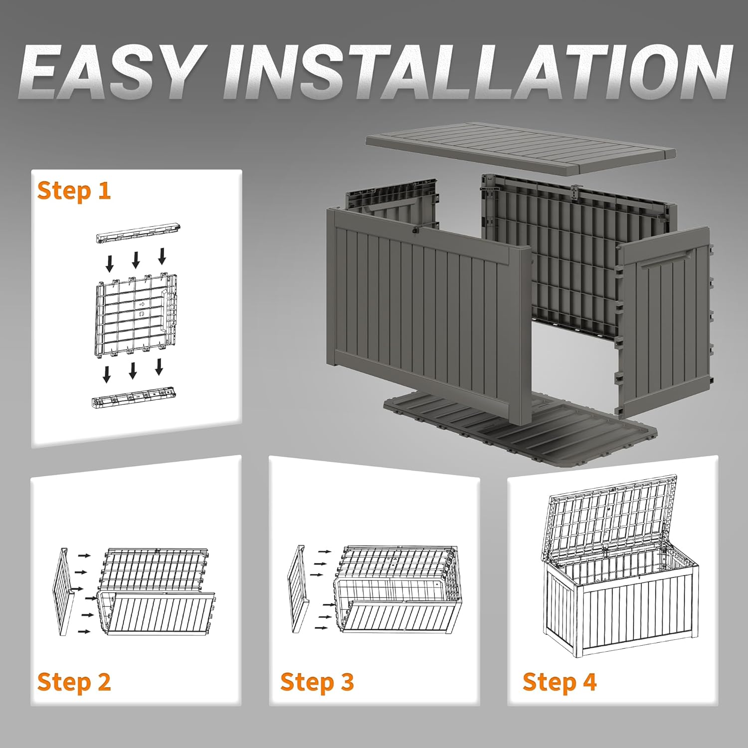 - β Weatherproof & Durable Construction Built with high-quality resin, this waterproof deck box offers superior protection against UV rays, rain, snow, and extreme temperatures. Its fade-resistant and rustproof design ensures longevity, while the double-wall construction adds extra sturdiness. No matter the season, your outdoor storage container will maintain its sleek look while keeping your items dry and well-protected.
