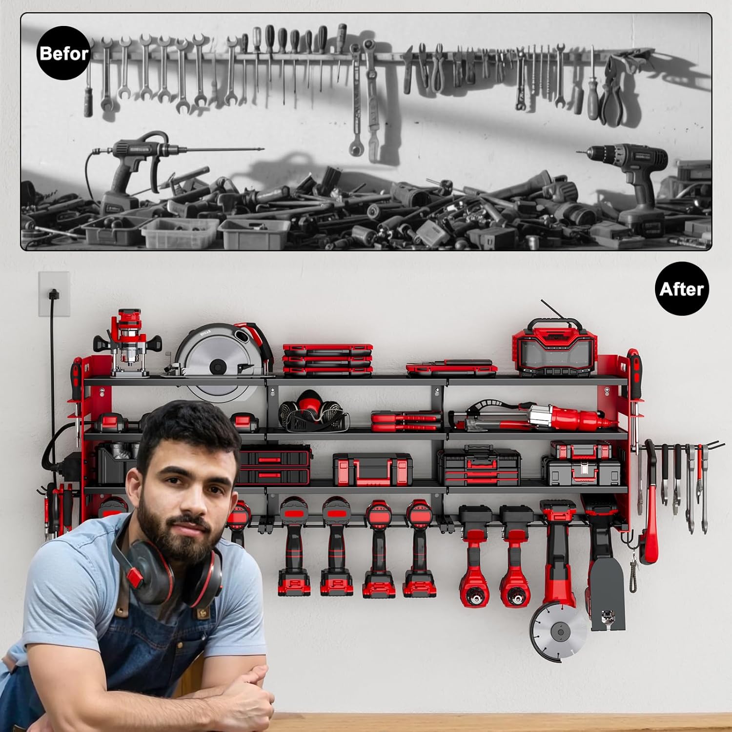 - Customizable Design: The 4-hole power strip can be mounted on either side for convenience, and the adjustable shelves give you full flexibility to organize your tools the way you want