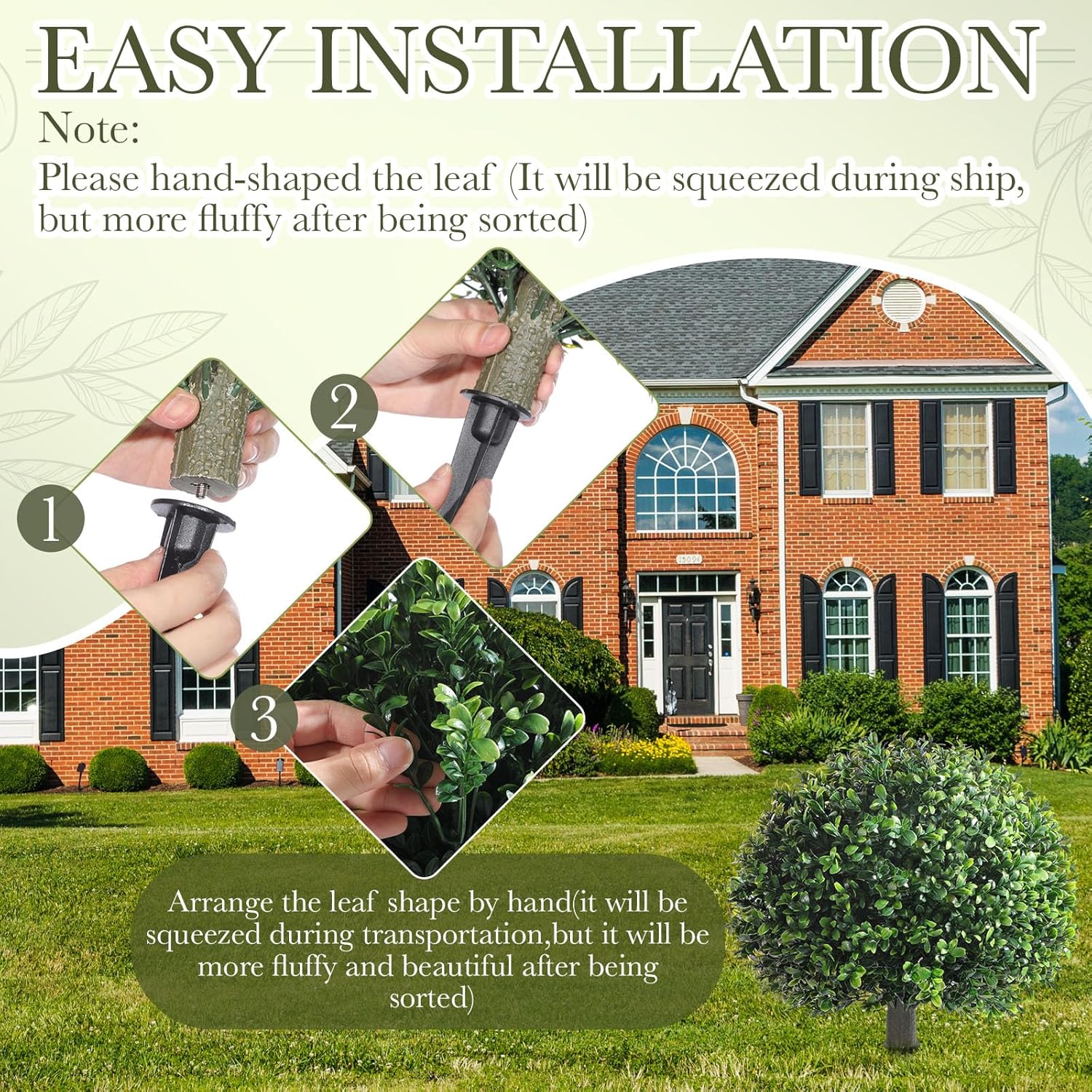 - Easy Installation: after assembly, you may need to manually adjust the leaves to achieve the desired shape; The design of the ground spike allows you to easily insert it into soil, grass or flowerpot without additional tools, making the installation simple and the placement flexible; If any leaves fall off during unpacking, just reattach them to the branches effortlessly