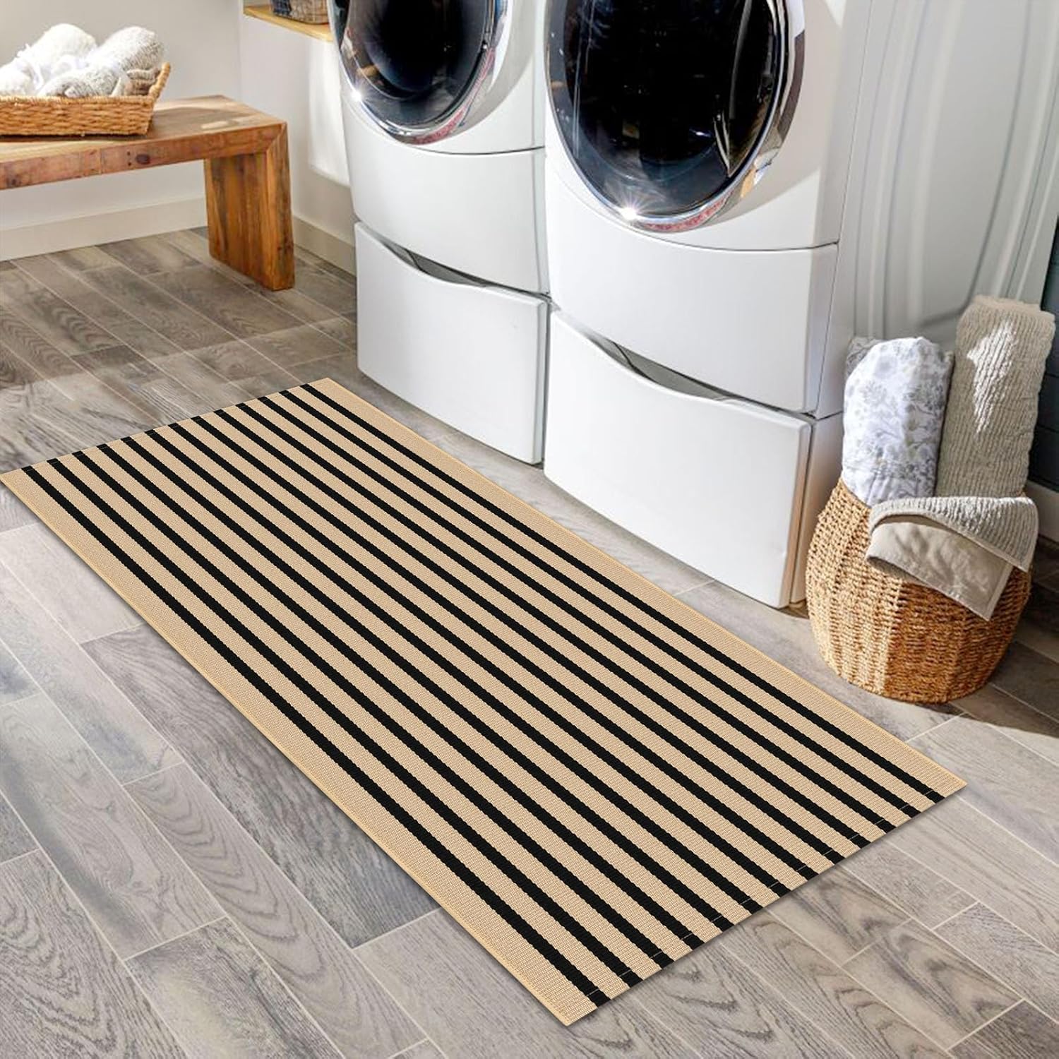 - Easy to Clean: This tan and black striped rug is simple to maintain with machine wash or vacuuming to remove dirt. The rug is sturdy and can be tumble dried on low. Keep your door rug fresh and clean with minimal effort. NOTE: Cotton rugs normally shrink slightly after washing