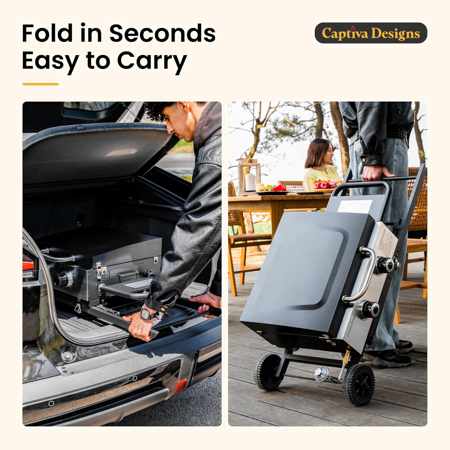 - ๐๐จ๐ซ๐ญ๐๐๐ฅ๐ ๐ ๐ฅ๐๐ญ ๐๐จ๐ฉ ๐๐ซ๐ข๐ฅ๐ฅ: Our portable gas griddle grill comes with a wheeled stand and a built-in handle, making it easy to move around. The stand is foldable, and when folded, it is about the size of a standard suitcase, allowing it to fit easily in a car trunk without taking up too much space. It's an ideal choice for camping and tailgate parties.