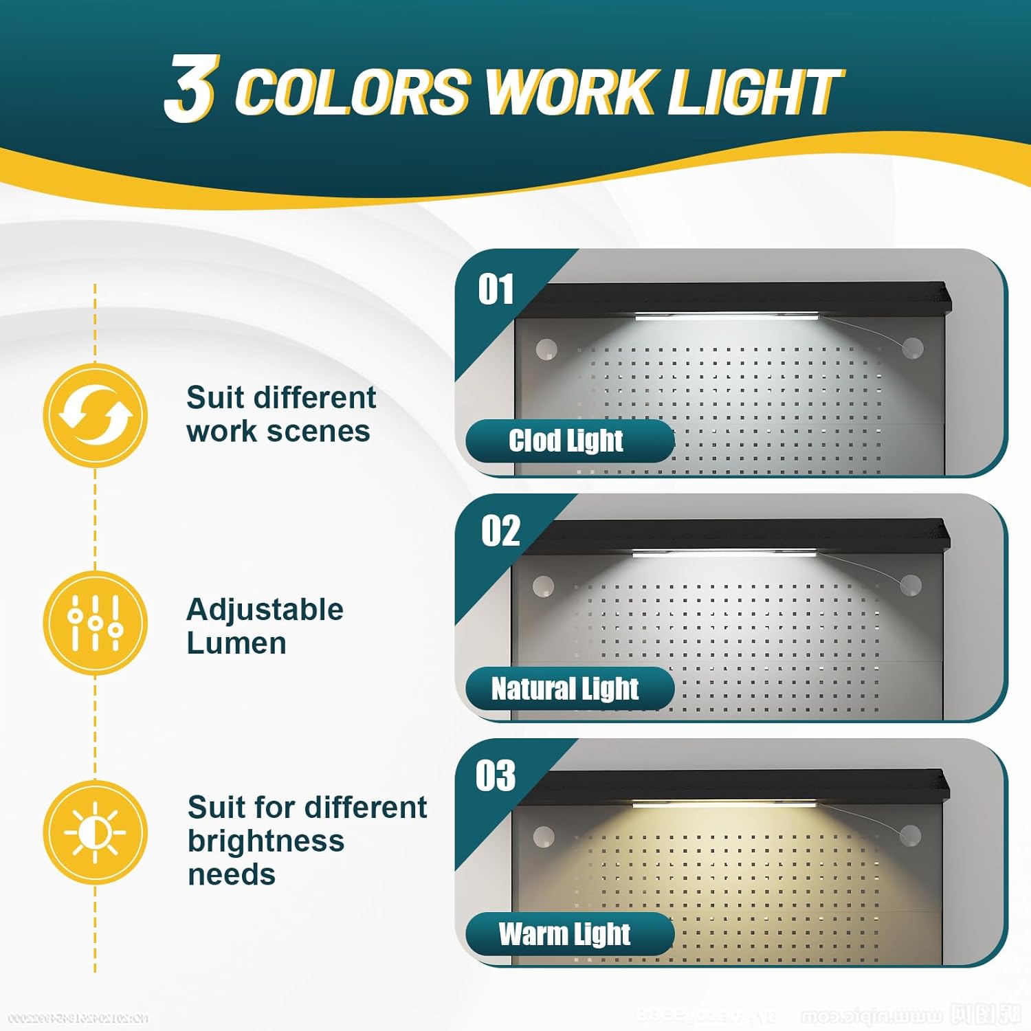 - Adjustable Lighting System:The work benches for garage is equipped with a colour temperature (3000K-6000K) and brightness dual-adjustable magnetic LED strip, you can adjust the colour temperature and position of the strip according to the need to meet the needs of precision work/industrial maintenance/handmade creations in multiple scenarios, and the non-glare design protects your eyesight.