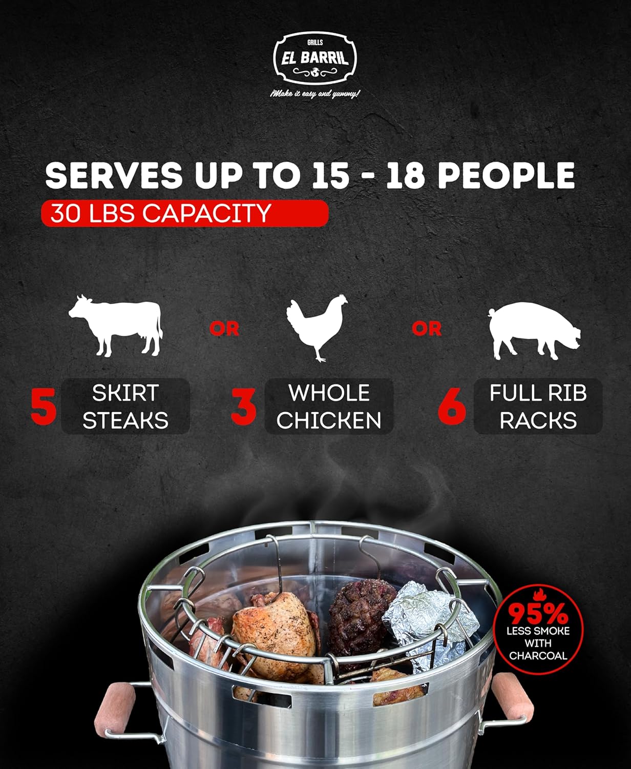 El Barril Lite Medium Barrel Smoker Grill, Stainless Steel 430, 30 lb Capacity, 12 Meat Hooks, Upper Grill and Handler, Portable Charcoal BBQ (Lite 30LBS Medium)