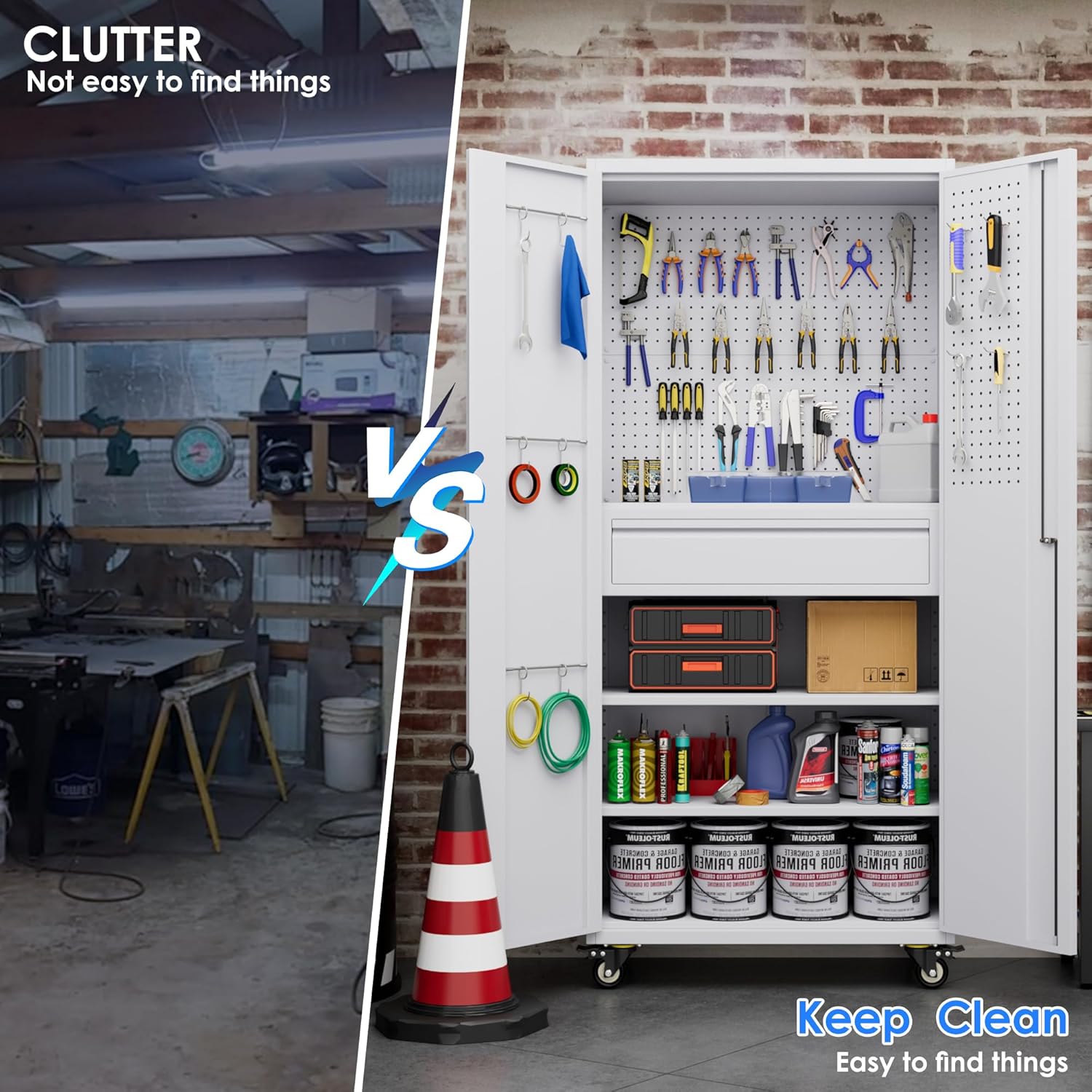 Metal Garage Cabinet with Wheels,71''H Rolling Lockable Steel Tool Cabinet with Pegboard & Drawer for Garage,Home,Office Assembly Required,White