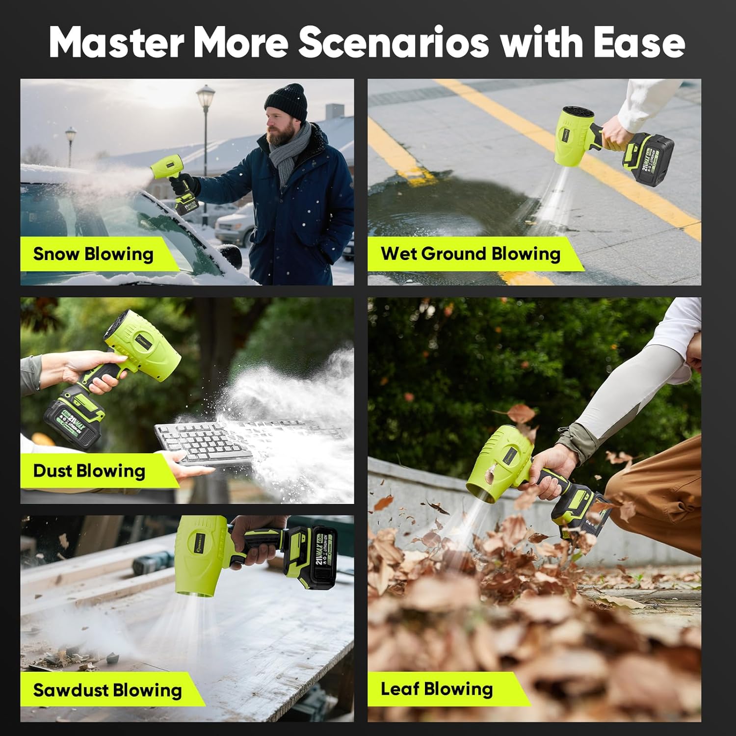 - ăUltimate Versatility â From Yard to WorkshopăSakerplus blower isn't just for leavesâit's your year-round cleanup companion! Effortlessly clear fallen leaves, patio dust, light snow, and shallow puddles around your home. Tackle workshop messes with the blower too, with precision airflow to sweep away sawdust, wood chips, and debris from workbenches, tools, and corners. No more juggling multiple toolsâjust grab, point, and blast away anything from delicate pollen to damp debris.