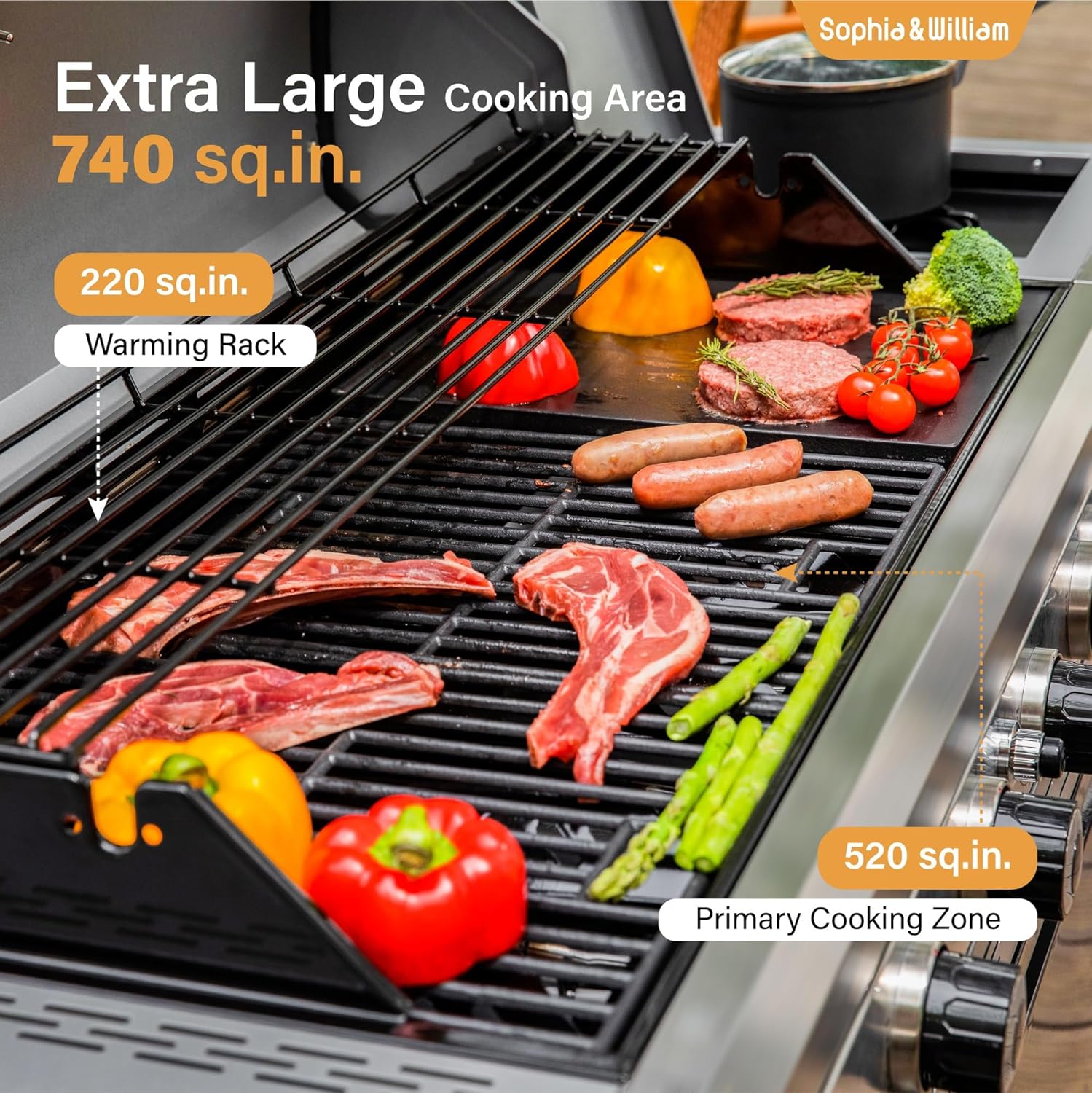 - ššš®š¹-ššš»š°šš¶š¼š» š£š¼šæš°š²š¹š®š¶š»-šš»š®šŗš²š¹š²š± šš®šš ššæš¼š» ššæš®šš²š: Sophia & William 6-burner gas grill features innovative grill griddle combo grates, offering authentic sear marks on one side and a flat-top cooking surface on the other. Made from heavy-duty cast iron for superior heat retention, the reversible design provides ultimate versatility - perfect for steaks, burgers, pancakes, and stir-fry. Enjoy professional results and effortless cleanup with this all-in-one outdoor cooking solution