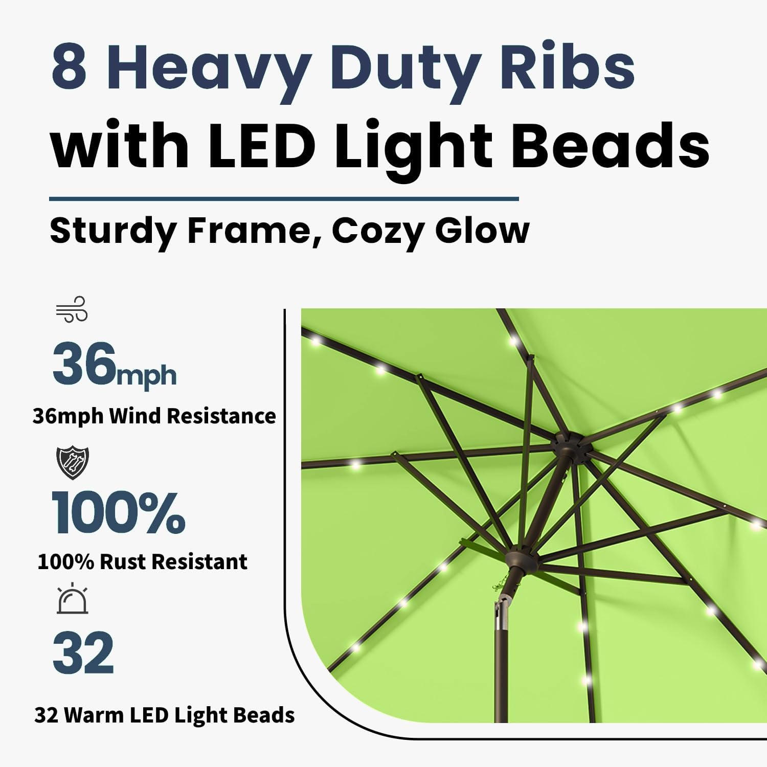 10FT Solar Umbrella 32 LED Lighted Patio Umbrella Table Market Umbrella w/Tilt and Crank, UV-Resistant Outdoor Umbrella for Pool, Garden, Deck, Apple Green