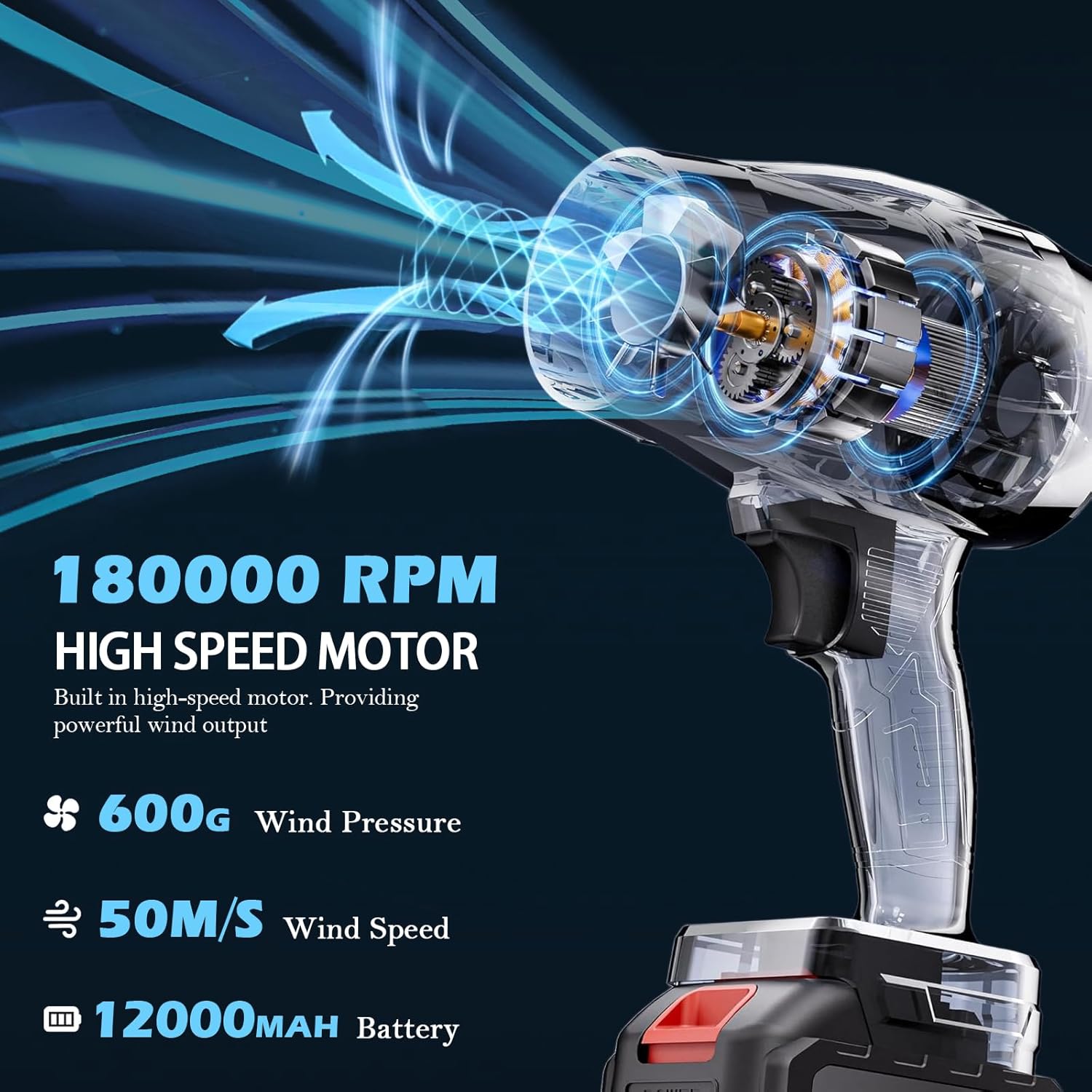 - ăPowerful PerformanceăThis cordless leaf blower is designed with an advanced high-speed turbine motor and large-size turbo blades, with a rotational speed of up to 180000 RPM, and its blowing power is 600G. The leaf blower power is long-lasting and stable, with strong load capacity, and will not overheat even if it works at full load for a long time. The matching earbuds will provide a comfortable working environment without sacrificing performance.