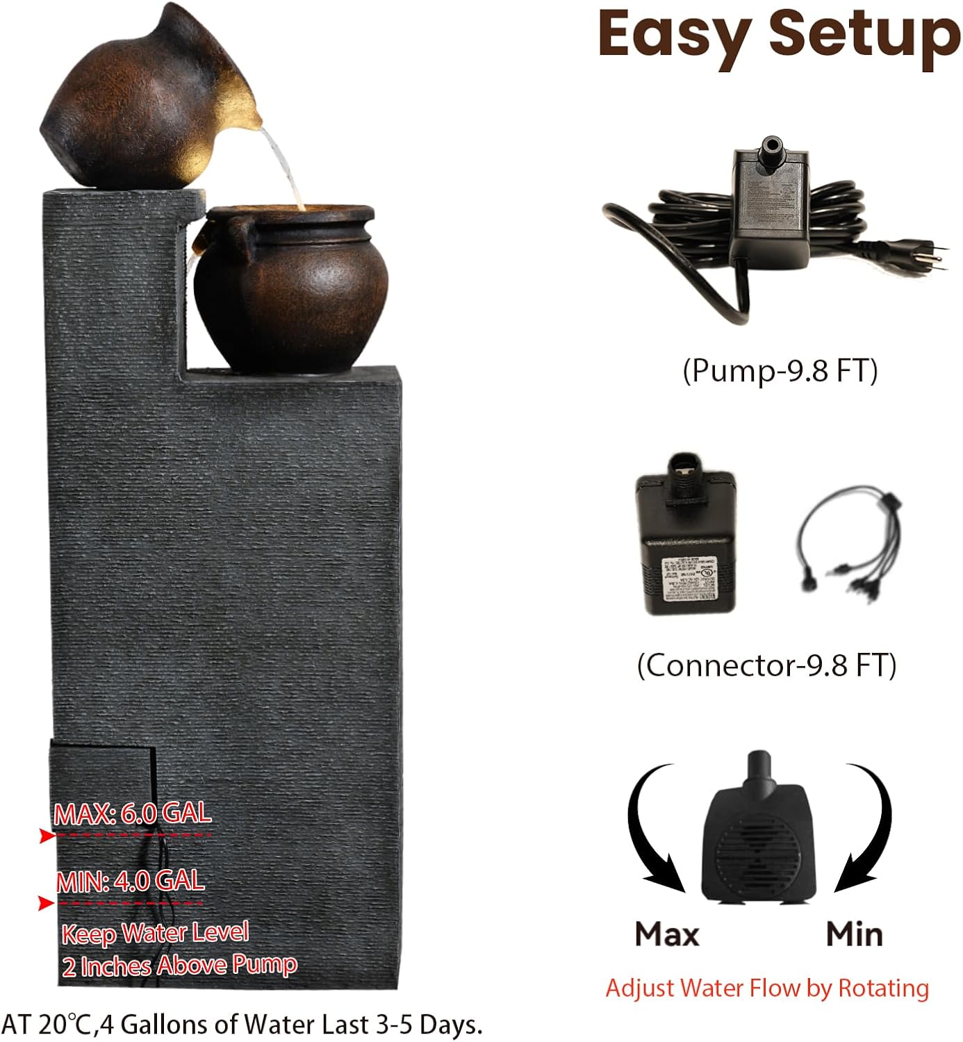 - SIZE & PACKAGE: The 18.5"L x 14.6"W x 53"H tall water fountain package includes: patio water fountain (39 lbs)1, transformer with 9.8 ft power cord*1, pump*1, and instruction manual*1. The outdoor fountain and waterfall are easy to set up, maintain, and clean — an excellent choice for decorating your outdoor living space