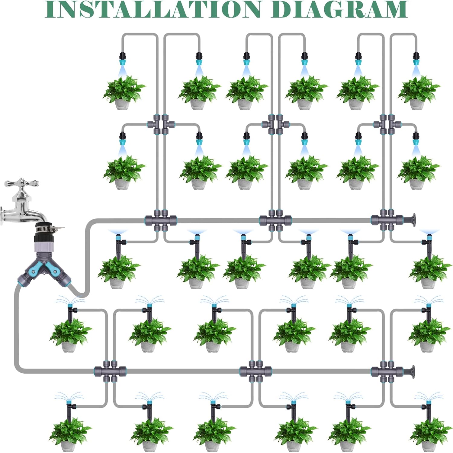 - 【Efficient Water Distribution Setup】Establish a 3/4 connection from your water source to the watering area.Utilize the 1/2-inch irrigation tubing as the mainline, branching off with the 1/4-inch drip irrigation tubing.Connect up to 30 drip irrigation emitters for comprehensive coverage. With our micro drip irrigation system, you can save water usage compared to traditional watering methods.