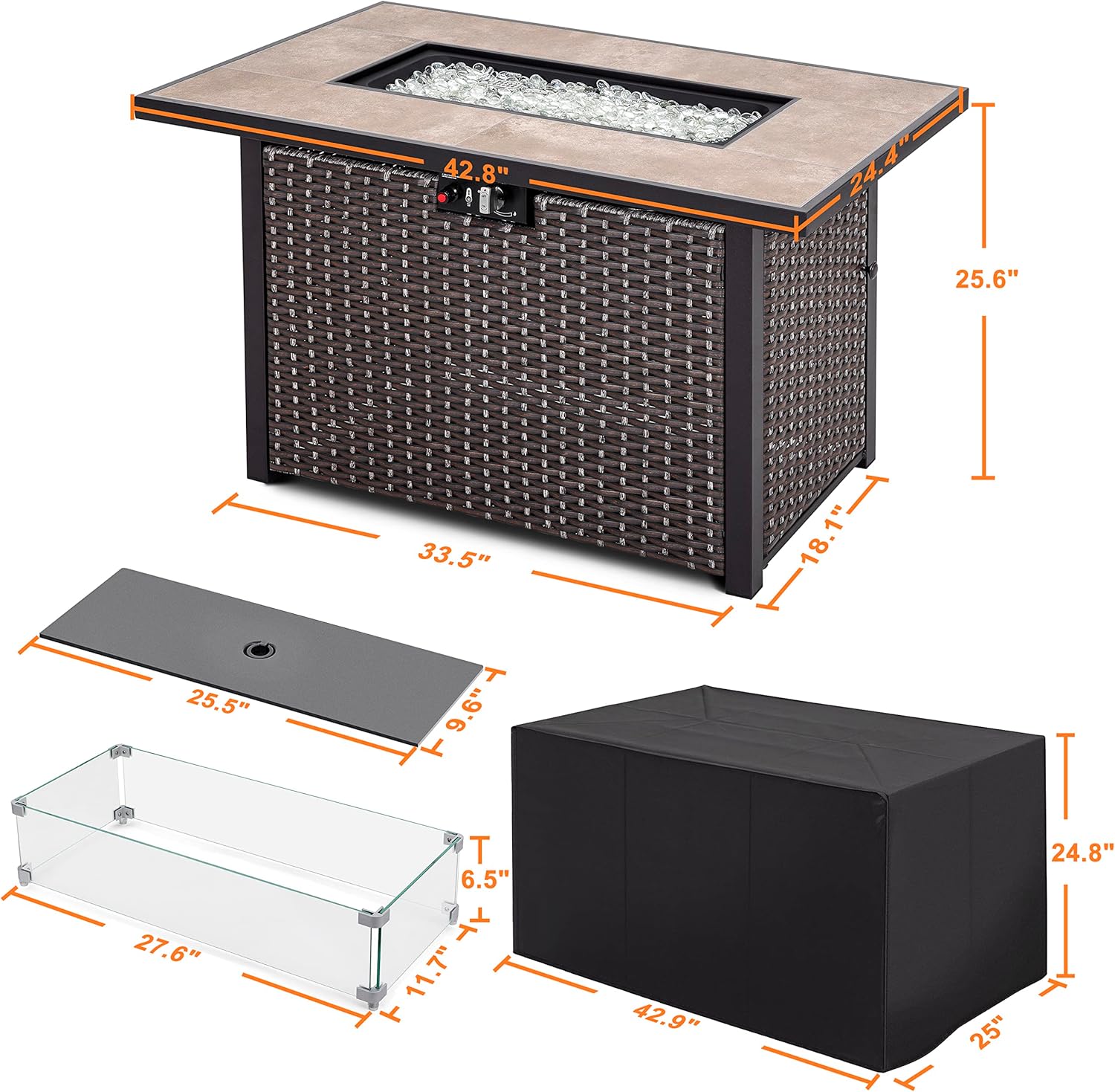 Nuu Garden Outdoor 43" 50,000 BTU Propane Gas Fire Pit Table, Ceramic Tabletop and Rattan Weaved Iron Frame, Water-Proof Oxford Cover, Glass Wind Guard, Glass Beads, Lid Included, Dark Brown & Coffee