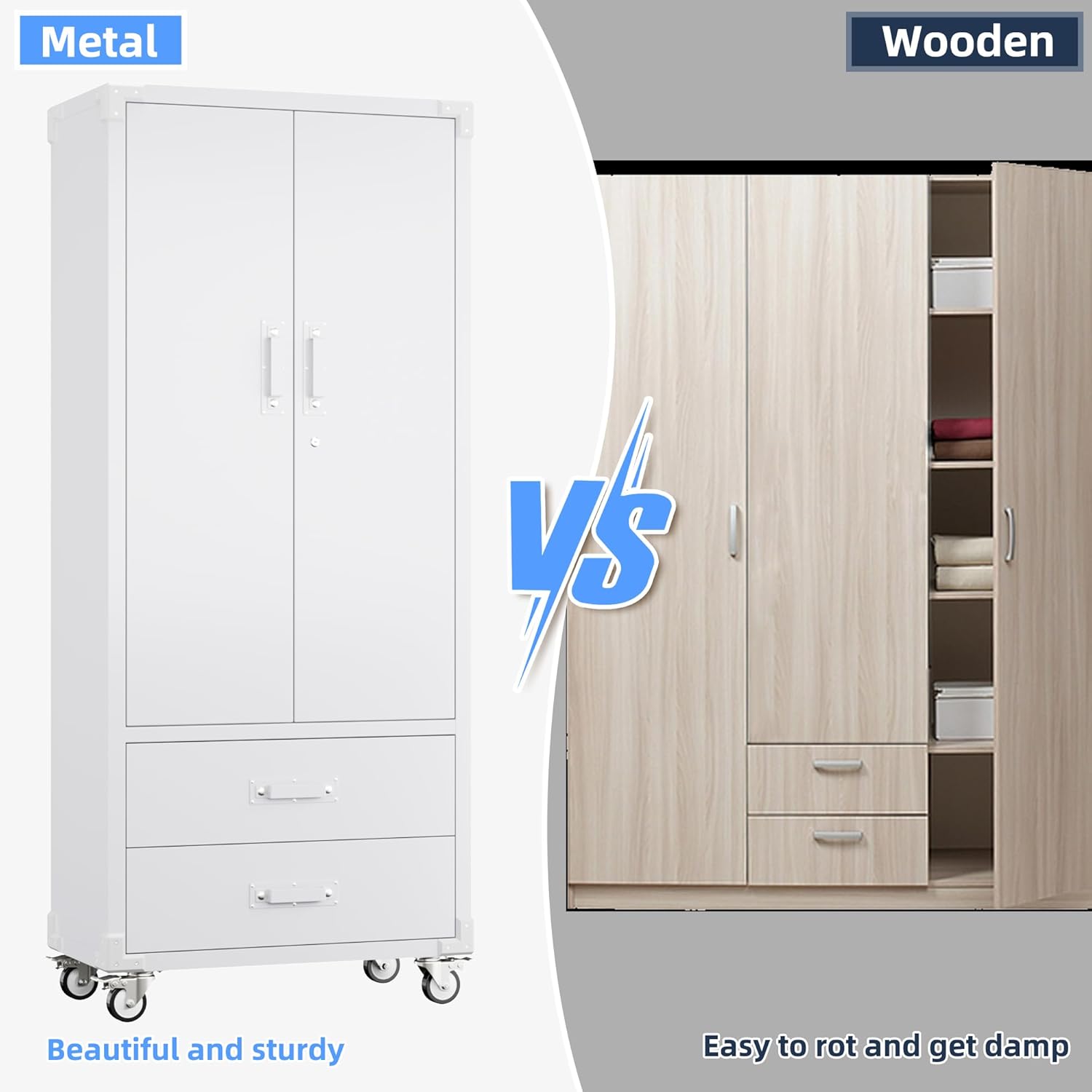 Upgraded Metal Garage Storage Cabinet with Wheels and 2 Drawers, Rolling Tool Cabinet with 3 Shelves and Pegboard Behind The Door for Home Office Garage,Assembly Required,White