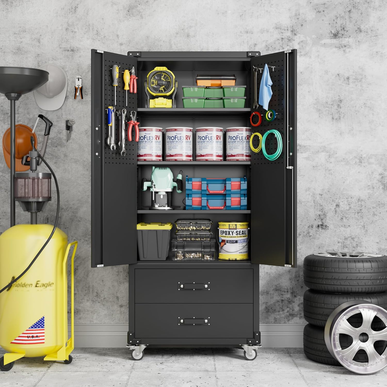 - 【Upgraded Magnet Attraction & Pegboard Function 】Magnetic suction is installed on the top and bottom of the cabinet, so the door can be closed better, increasing safety and neatness.The pegboard function adds additional vertical storage space,metal storage cabinet with wheels can be used in a variety of places and occasions, such as home, garage, school, office and so on.