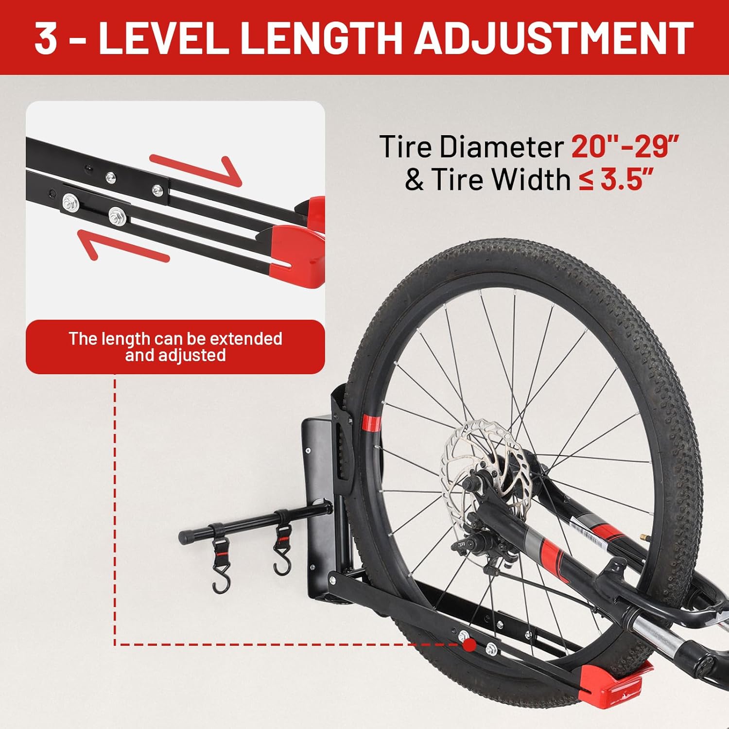- 【Versatile Bike Compatibility】AUMENTAR bike rack garage wall mount is compatible with a wide range of bicycles, including mountain bike, road bike, cruiser bike, folding bike, and kids' bike with tires diameter of 20""-29"" and width up to 3.5"". The adjustable arm length allows it to adapt to different tire sizes.