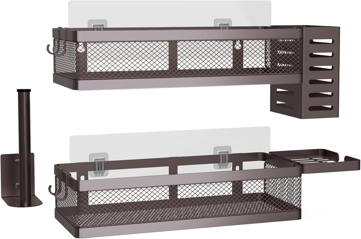 - 【MULTI-PURPOSE&MULTIFUNCTIONAL】5 Hanging Storage Baskets Organizer Set for Sufficient Bathroom Kitchen Storage Space, The bathroom&Kitchen organizer comes with 5 pieces for different uses, including 2 Hanging Storage Baskets, 1 soap holder,1 Tissue holder ,1 utensil holder and 2 adhesives. The perfect solution for organizing a multitude of every items indoor or outdoor. The cabinet organizer hanging baskets wall mount is Ideal for organizing and storing spice bottles, pantry items, snacks, toiletries, tools, craft supplies,etc. And this metal bin basket free up enough space for your homes, kitchen, living room, bathroom, camper, farmhouse, apartments, college dorm rooms, etc.