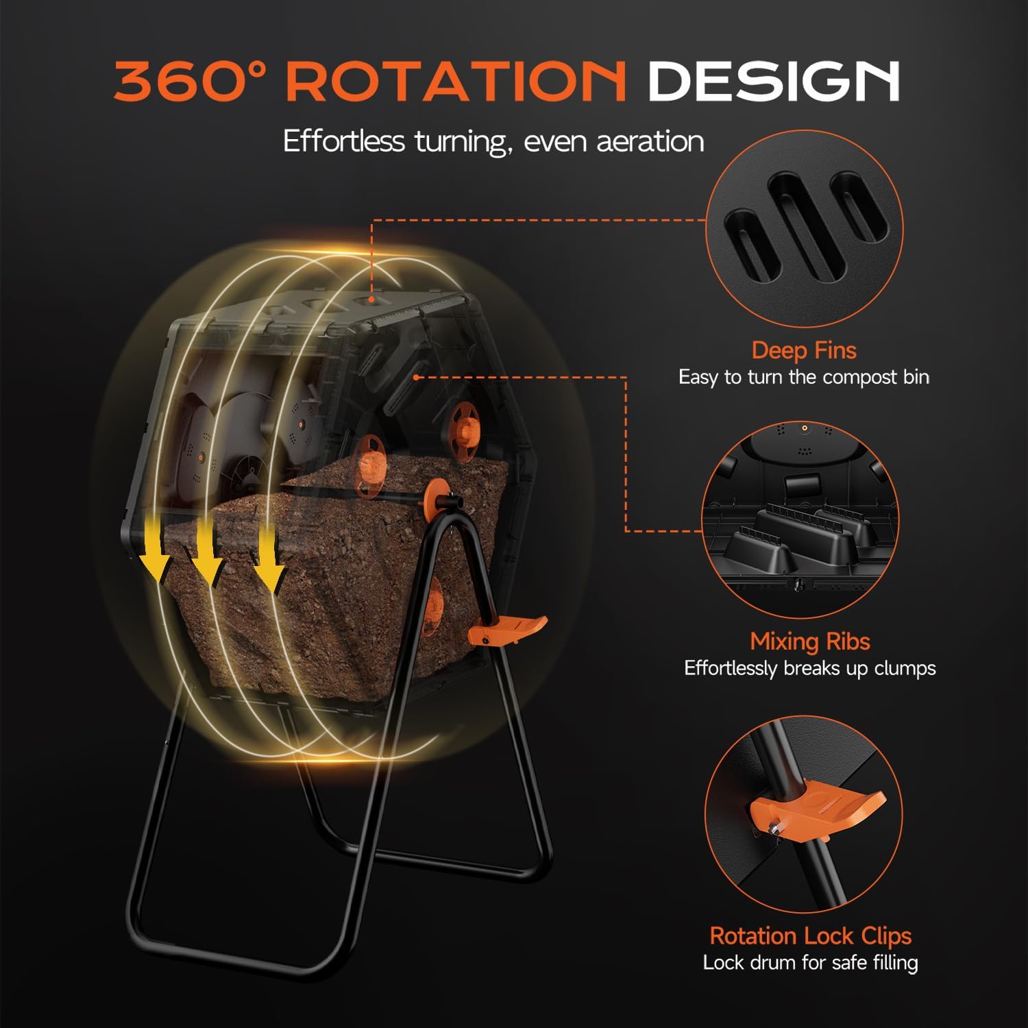 - 【Effortless 360° Tumbling】Simply rotate the outdoor compost bin 360° using the deep-grip grooves. Built-in mixing ribs break up clumps and aerate materials thoroughly – no manual turning required. Side-mounted rotation lock clips securely hold the drum for safe filling and unloading