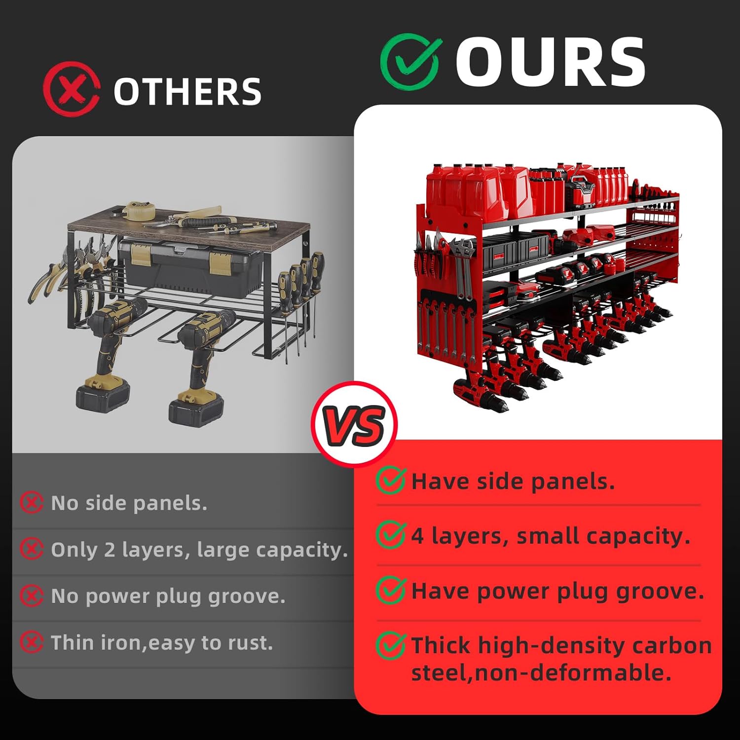 - 【800 POUNDS LOAD】This heavy-duty power tool organizer is made of heavy-duty metal and protective coating,scratch-resistant, rust-resistant and anti-bending,no need to worry about the shelf breaking or falling off the wall. The wall mount design saves valuable floor space while keeping tools within reach,say goodbye to a messy workspace,put your tools all in a row.