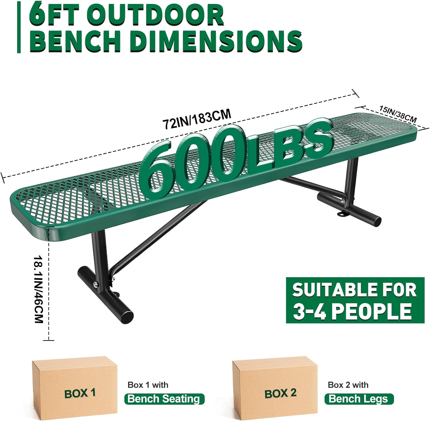 Heavy-Duty Park Bench or Table for Outside - Black Coated Outdoor Furniture Steel Bench, Commercial-Grade Outdoor Benches Weatherproof for Park, Patio, Porch (Green, 6FT (Without Backrest))