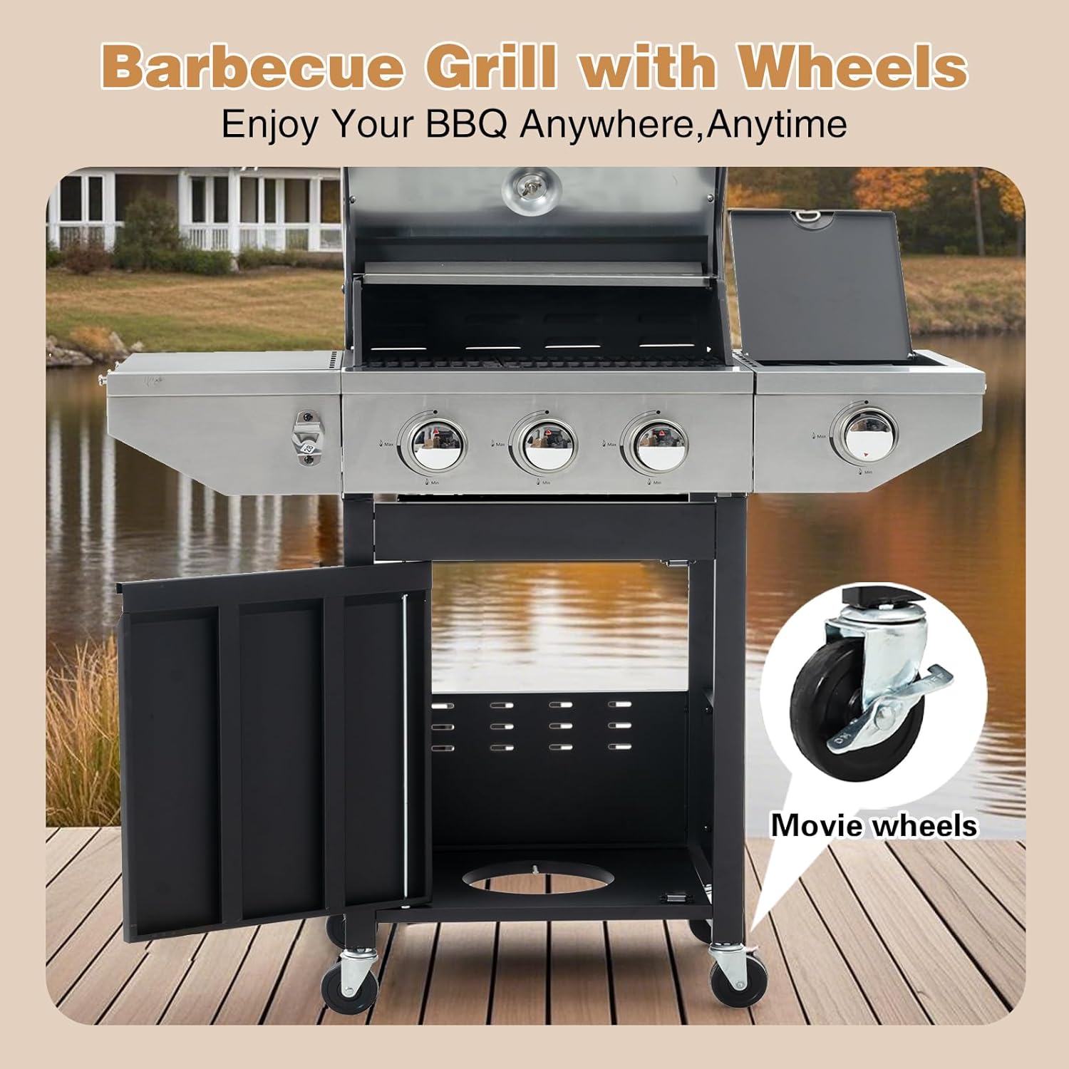 - Equipped with four universal wheels with locking devices, it is flexible and stable. The unique propane gas tank storage compartment is cleverly designed, safe and beautiful, suitable for various outdoor occasions, from patios to backyards, and can be easily placed
