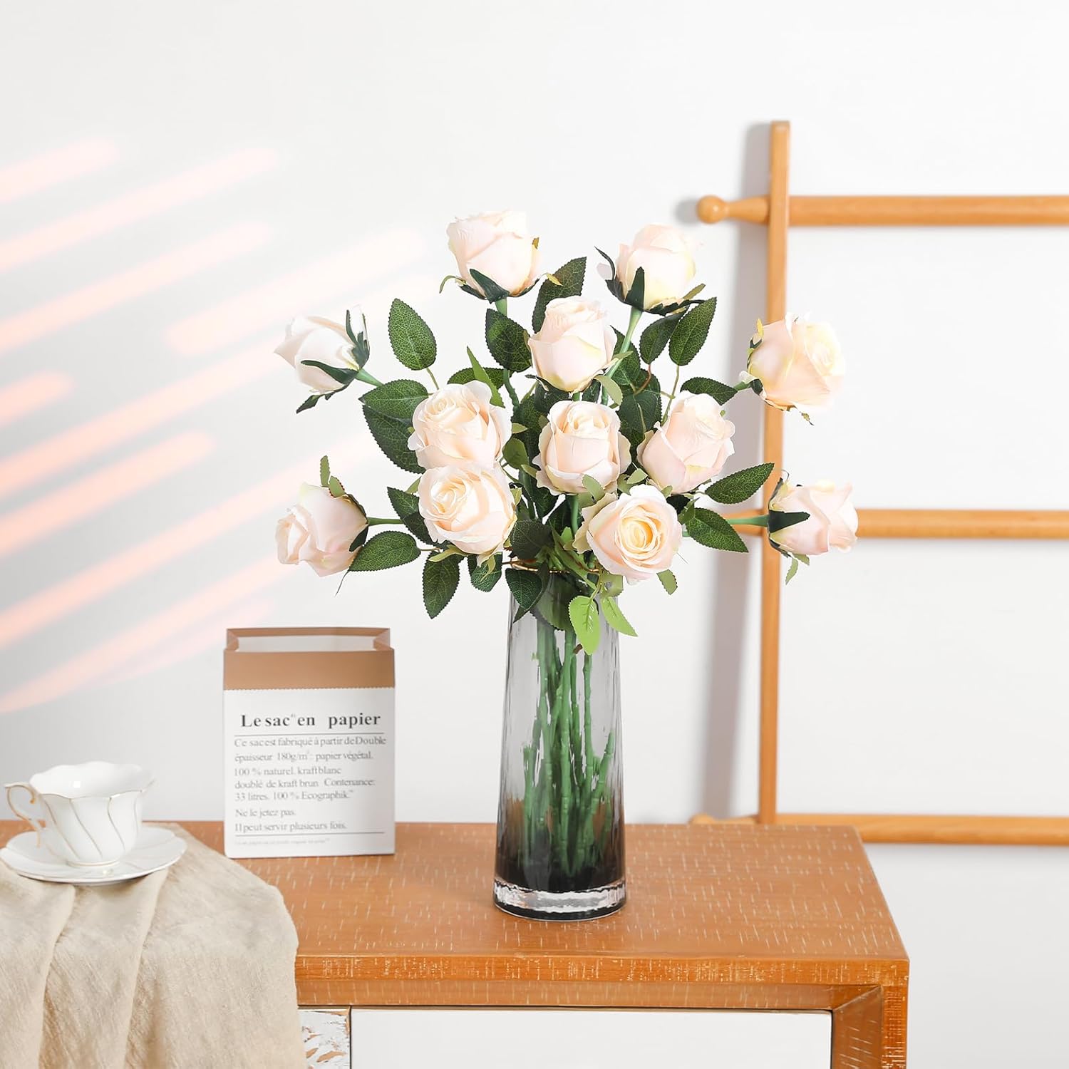 12Pcs Realistic Fake Cream Roses Faux Flowers with Long Stems, Artificial Silk Rose Flowers for Valentines Day Home Wedding Decor Bridal Bouquet