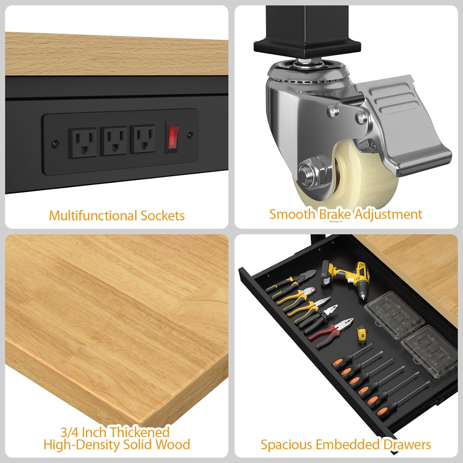 48" Adjustable Workbench,Heavy-Duty Work Table,3000 LBS Load Capacity Hardwood Workstation Outlets with Power Strips, Drawers and Wheels,for Workshop, Garage