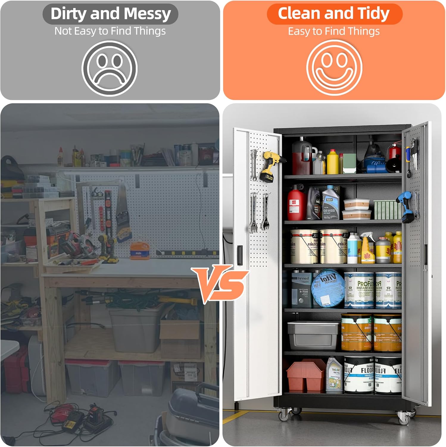- Universal Rubber Wheels: Metal garage cabinet with wheels comes with 4 lockable universal silent casters, providing full protection for all surfaces from scratch yet easy to move around