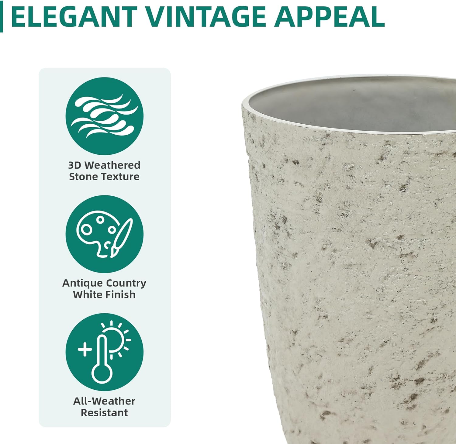 - Timeless Rustic Charm: Showcasing an antique country white finish and 3D weathered stone texture detailing, these tall planters bring a touch of vintage charm. It can effortlessly elevate the character of your front porch, patio or living room.