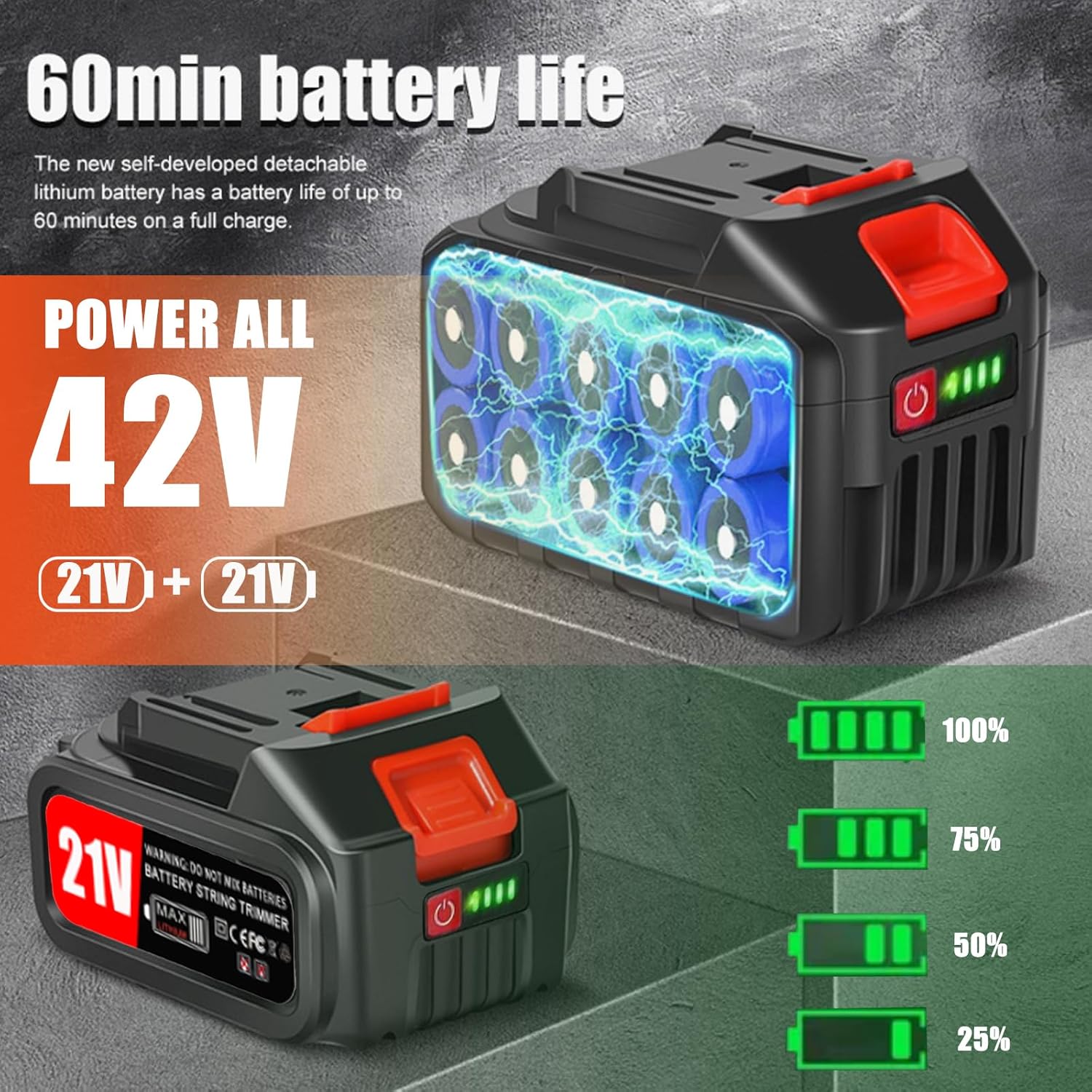 - 21V Battery Weed Wacker: This electric grass trimmer include 2pcs high capacity battery battery and fast charger that can provide super use life (1-2hour), You can use the 2 batteries alternately to provide continuous power for outdoor work. so you can trim more weeds in yard. Quieter, safer, more environmentally friendly and portable than gas or corded string trimmer, you can saves resources and money