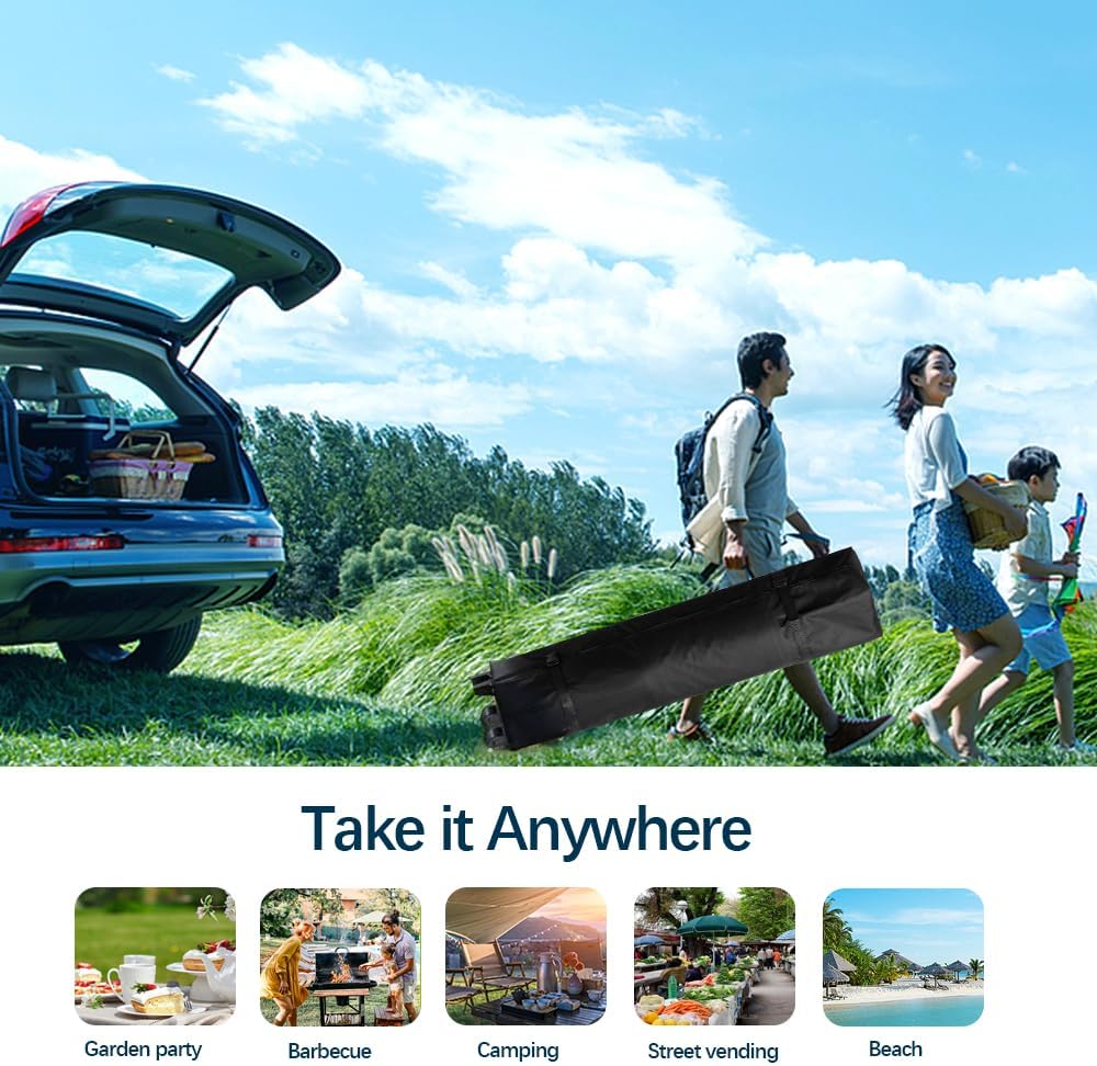 - 【All-in-One Rolling Storage Bag】 Includes 4 weight sandbags, 8 ground stakes, and 4 wind ropes. The heavy-duty wheeled bag has reinforced corners, smooth-glide wheels, and multiple carry handles. Top and side fabric handles make transport easy for one or two people. Take your portable canopy anywhere with ease.