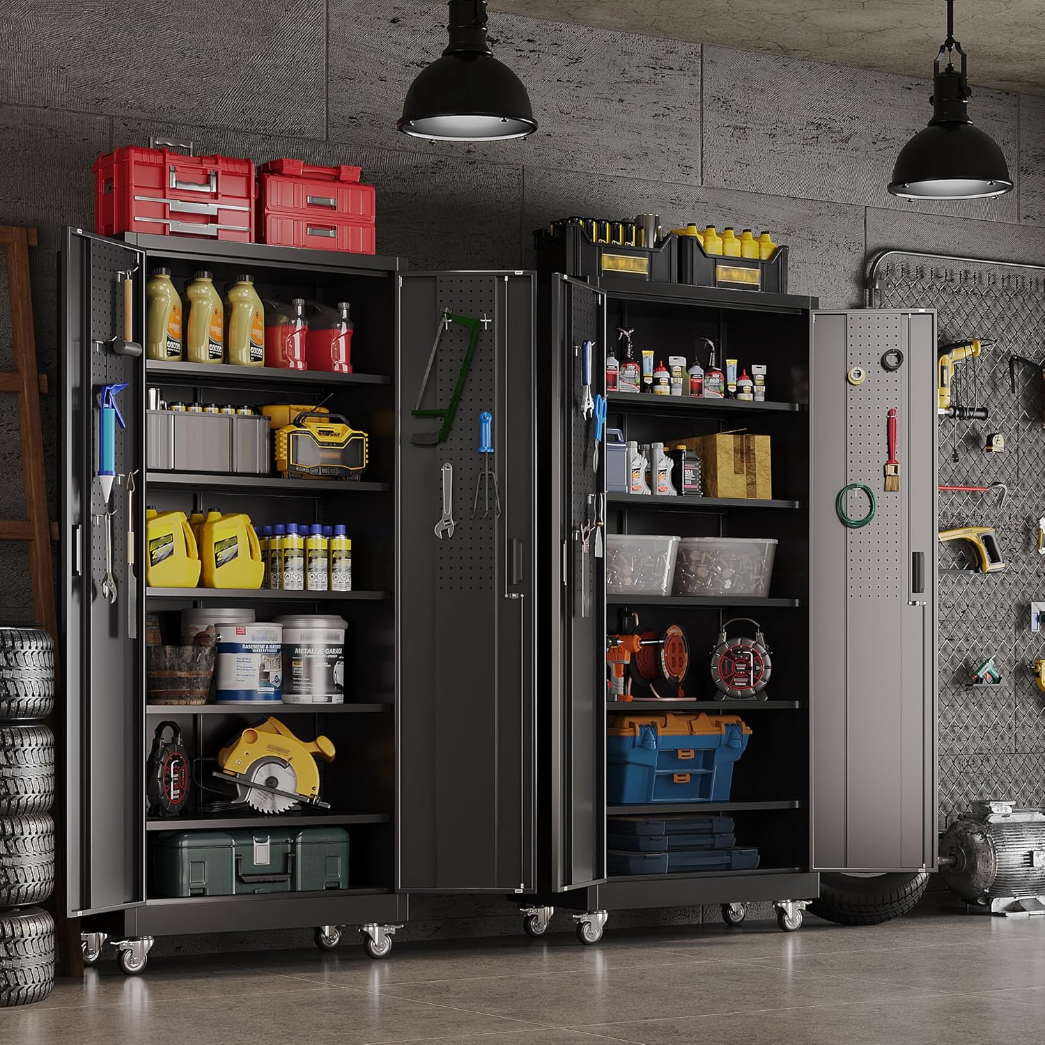 - Universal Rubber Wheels: Metal garage cabinet with wheels comes with 4 lockable universal silent casters, providing full protection for all surfaces from scratch yet easy to move around