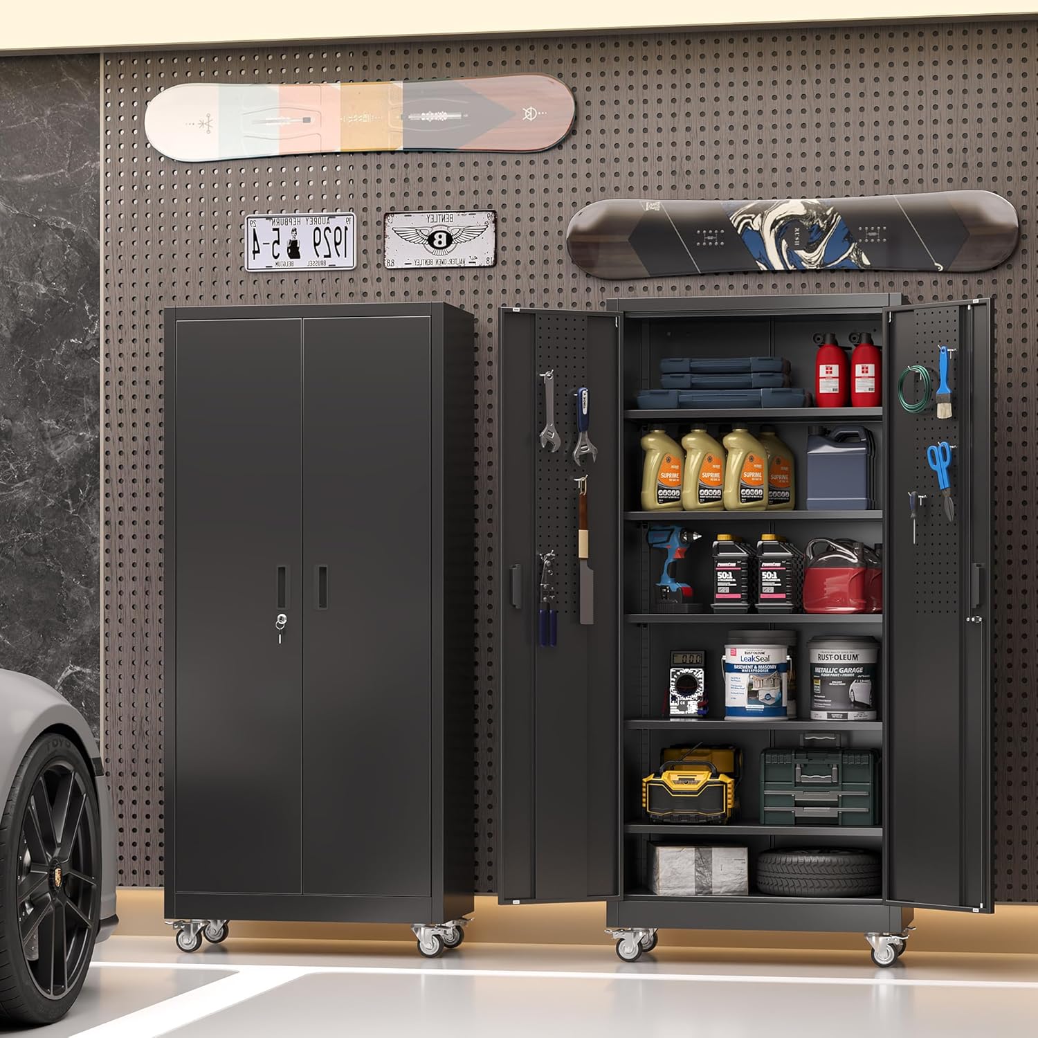 - ăUtility Pegboard & 5 Adjustable Shelves ăRedesign your organizing ways, hang up everything on the door, get effortless accessible for a variety of small hardware, no more searching for things among the clutter. Tall garage storage cabinet with wheels is designed with 5 adjustable shelves, you can easily meet your different storage needs by adjusting the height between the shelves.