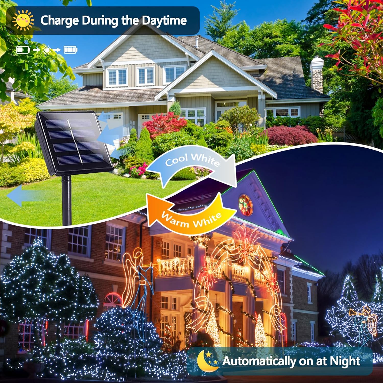 - 2025 New Upgraded Blue and White Solar Christmas Lights!!! More Brighter with Upgraded Bulbs , More Durable with High Quality 1800mAh Built-in Battery, Quick Charging Technology with Larger Solar Panel, IP65 Waterproof Performance, Flexible Sliver Wire