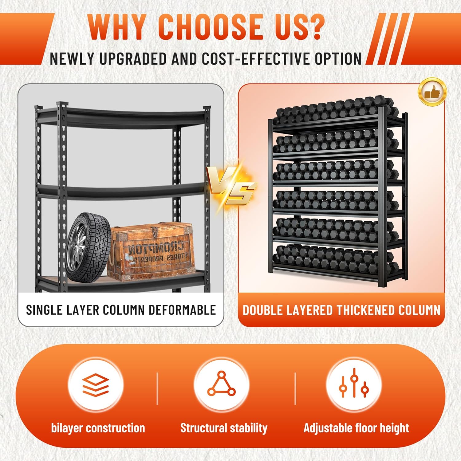 - ăThe double-layer column is more stable and reliableăOur garage shelves adopt double-layer columns, which are more stable and reliable than single-layer columns on the market. In the process of long-term use, there will be no bending and warping. The double-layer column greatly improves the weighing capacity of the partition, and even if a heavy object like an engine is placed on it, it will not shake.
