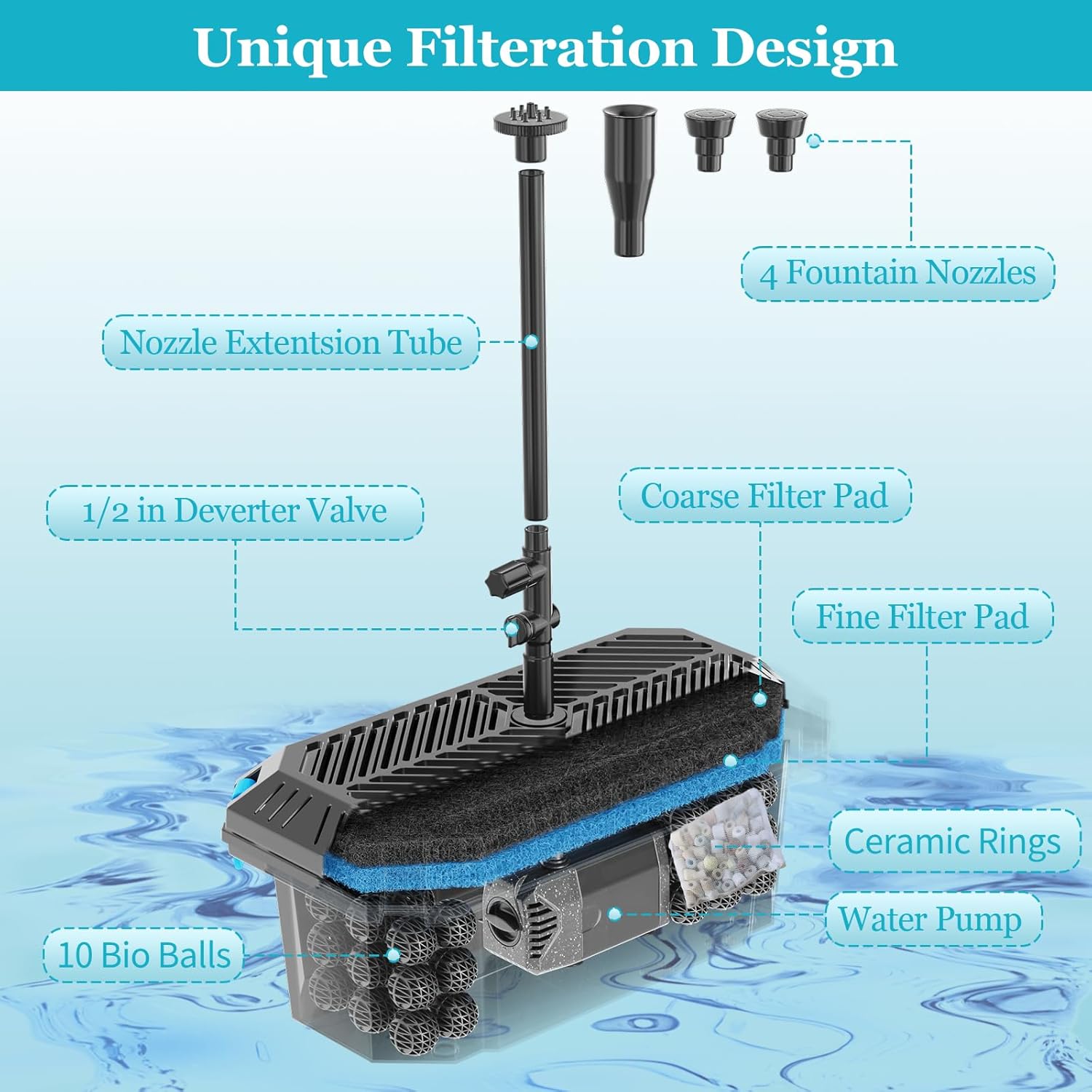 - 【Integrated Filtration System】POPOSOAP solar pond filter box is specially designed to keep the water healthy balance and clarity, can effectively filter debris and suspended particles in water, and protect pumps from debris in small pond. Maintain water sprayed crystal clear. It includes: 1* solar panel, 1* filter box, 1* pump, 4* nozzles & diverter valve, 2* Filter Pads, 10* Bio-Balls, 1 pack Bio Ceramic Rings and 1* Manual.