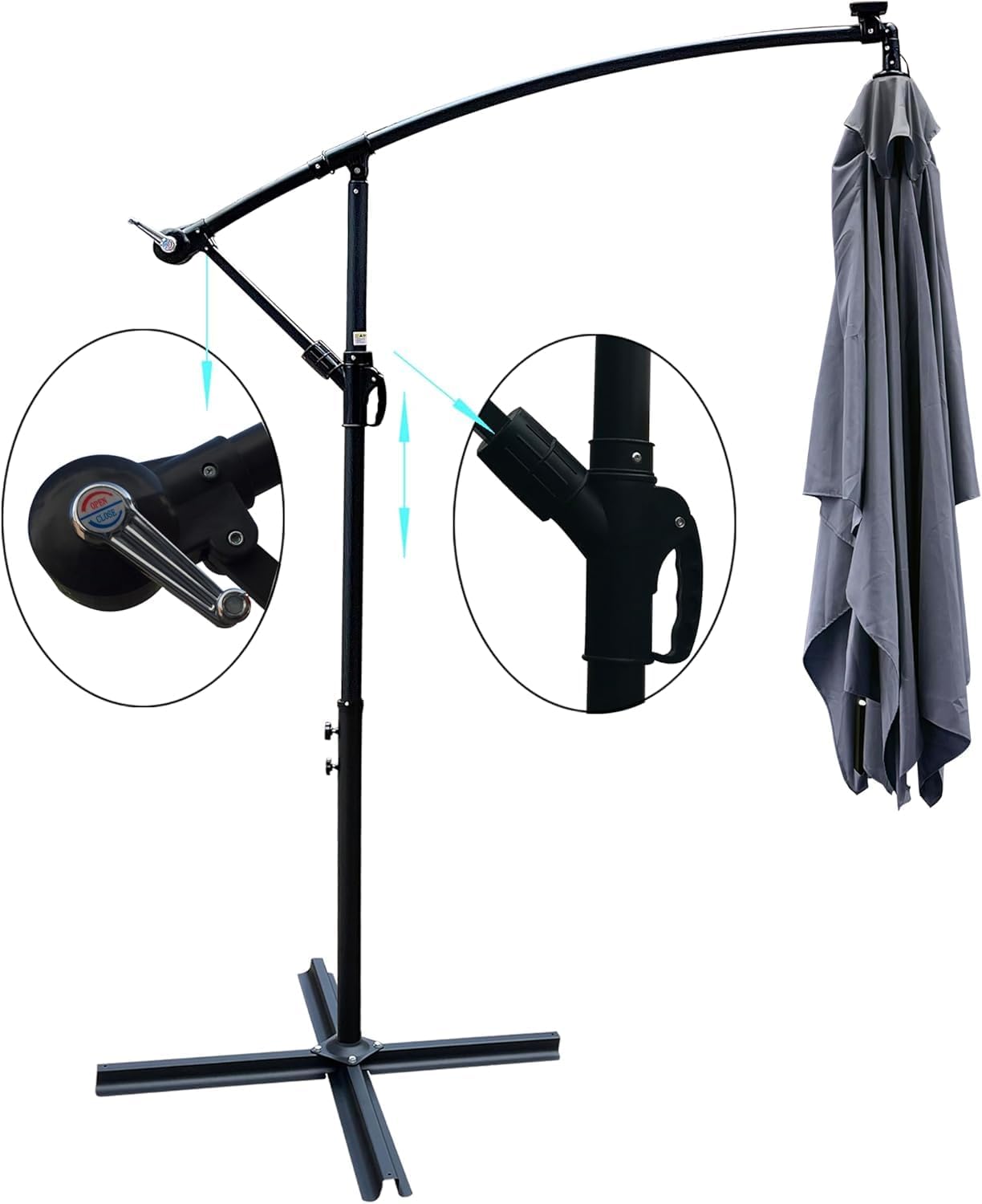 - โ HIGH DURABILITY: Crafted from 180G polyester fabric, this 10x6.5ft offset patio umbrella ensures fade resistance, waterproofing, UV protection, and easy cleaning. The 1.9" diameter rust-resistant pole, 6 sturdy steel ribs and cross base, with a powder-coated finish, can withstand winds up to 20 mph. The vented top design increases stability and keeps the area cool, making this cantilever umbrella ideal for long-term outdoor use.