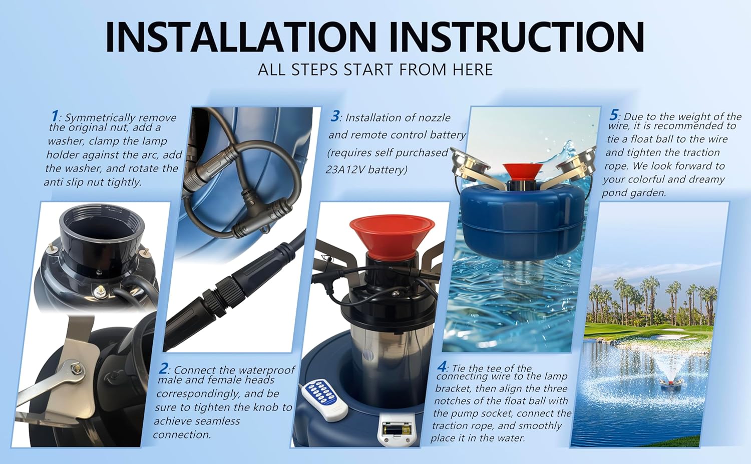 - To achieve the perfect effect, it is recommended to tie a floating ball one meter away from the power cord. High quality power cords are very heavy and can affect the balance of the fountain pump. Severely polluted water bodies can easily lead to blockage of the inlet, reduction of water volume, and changes in the height and width of the fountain, and should be promptly pulled back and removed.