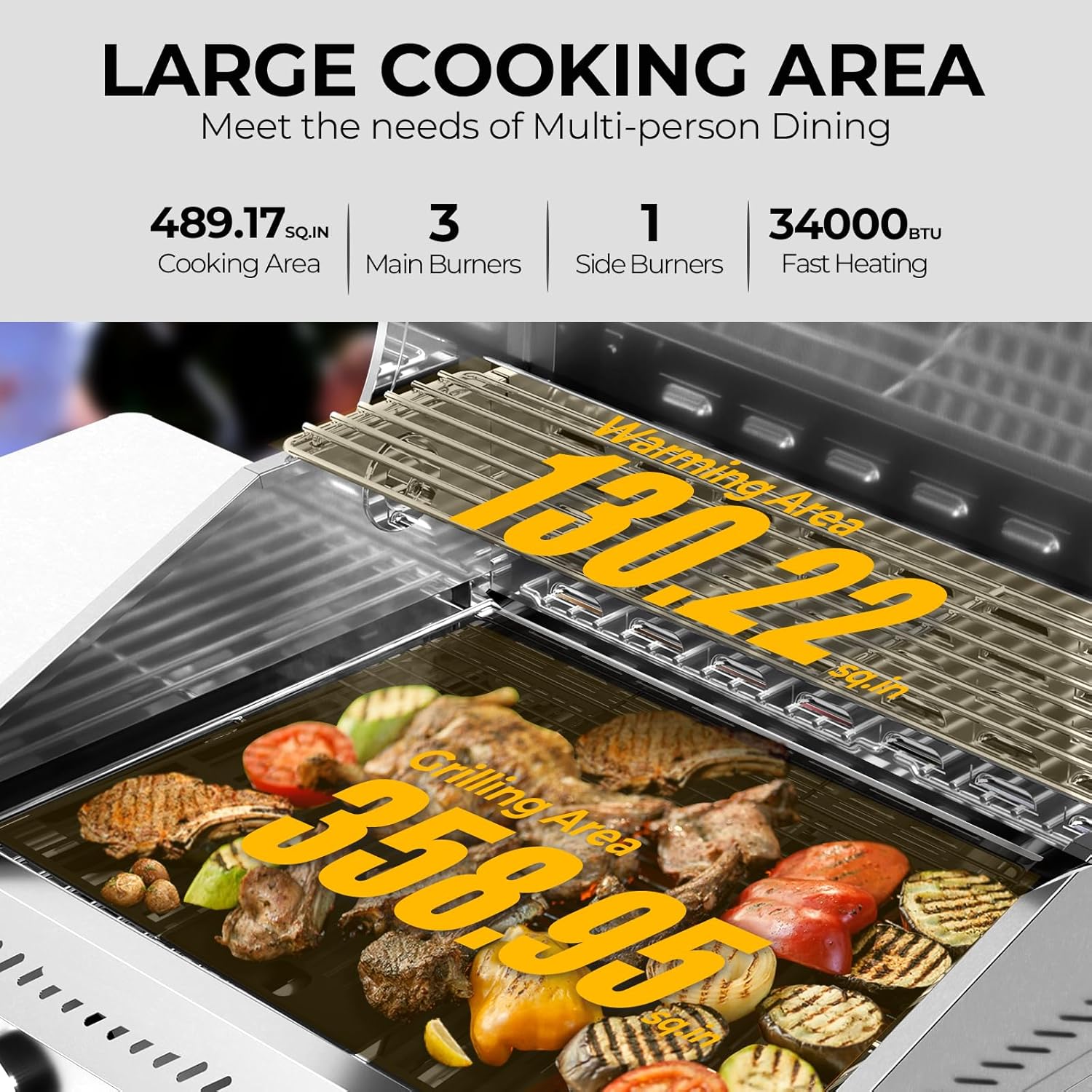 - Spacious Cooking Area & Storage : Offers 489.17 sq. in. total grill space (358.95 sq. in. main grilling + 130.22 sq. in. warming area). Built-in bottle opener, side hooks for tools, and bottom storage keep everything organized.