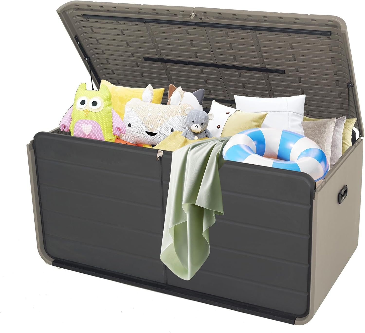 - ăLong Lasting Service LifeăWith high-density resin material, the waterproof outdoor storage chest prevents rusting, peeling and denting, lasting longer than wood. Moveover, the outdoor storage bin is built-in 3 pcs reinforcing crossbars rods which can prevent deformation after being exposed to the sun
