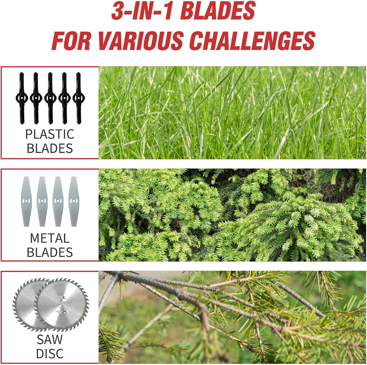 - 3-in-1 Versatility with 3 Blades:Transform your lawn care with three interchangeable blades: a weeding rope for soft grass, flat blades for fine weeds/shrubs, and a manganese circular saw for thick branches