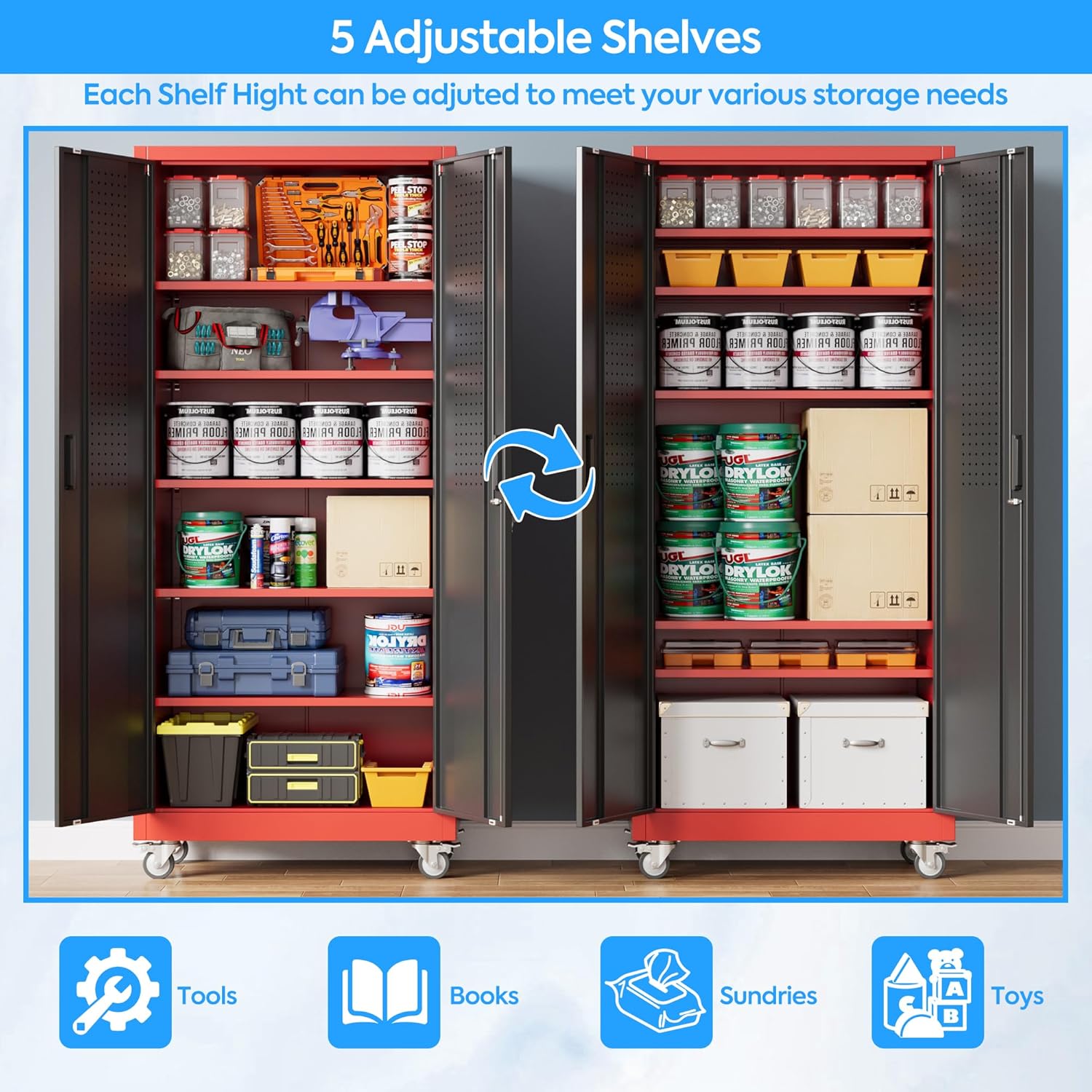 - Ample & Flexible Storage Solutions: Maximize organization with five adjustable shelves (customizable height) and pegboard on both doors, paired with 4 hooks for hanging tools, accessories, or gear. This design of the garage storage cabinet with wheels adapts to your needs, whether storing heavy-duty items or small essentials;