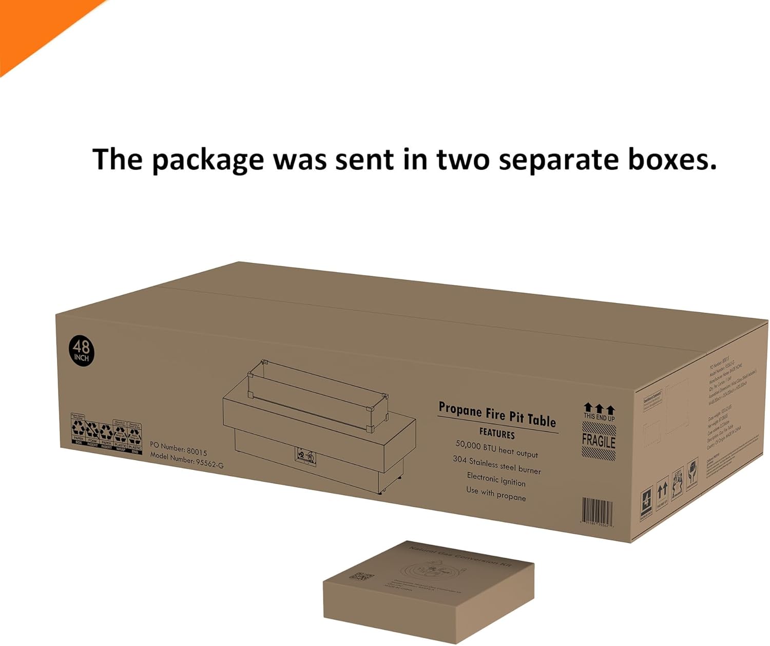 - Natural Gas Conversion Kit - Includes a natural gas conversion kit to convert the propane version to natural gas version, which will be shipped separately. We shipped the package in two separate boxes, It is possible that one package will arrive before the other.