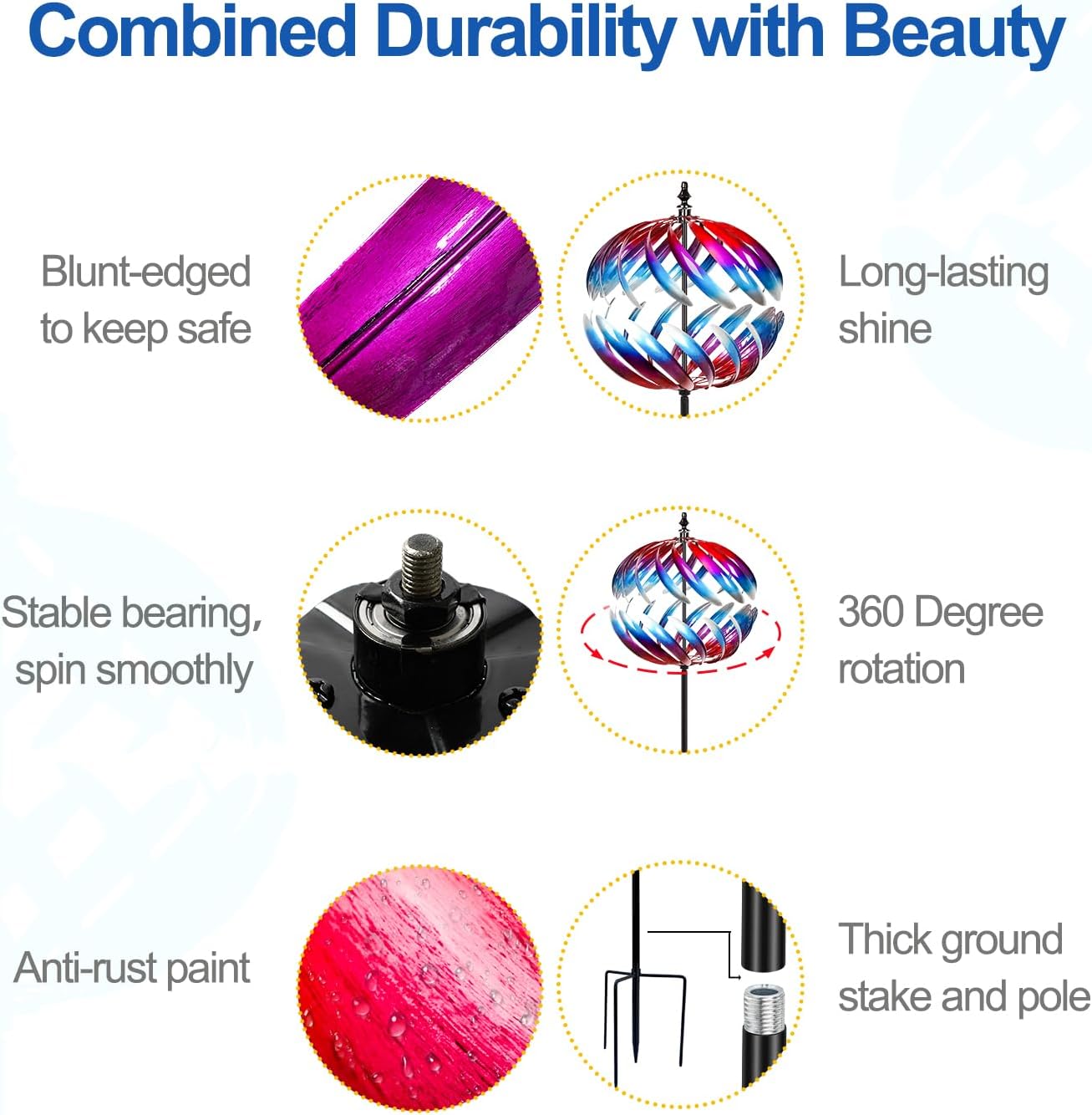 - Combined Durability with Beauty: Crafted for lasting beauty and smooth, seamless motion. Featuring a water-resistant bearing that adapts effortlessly to the wind, our large wind spinner resists rust and fading to maintain its charm and reliability season after season
