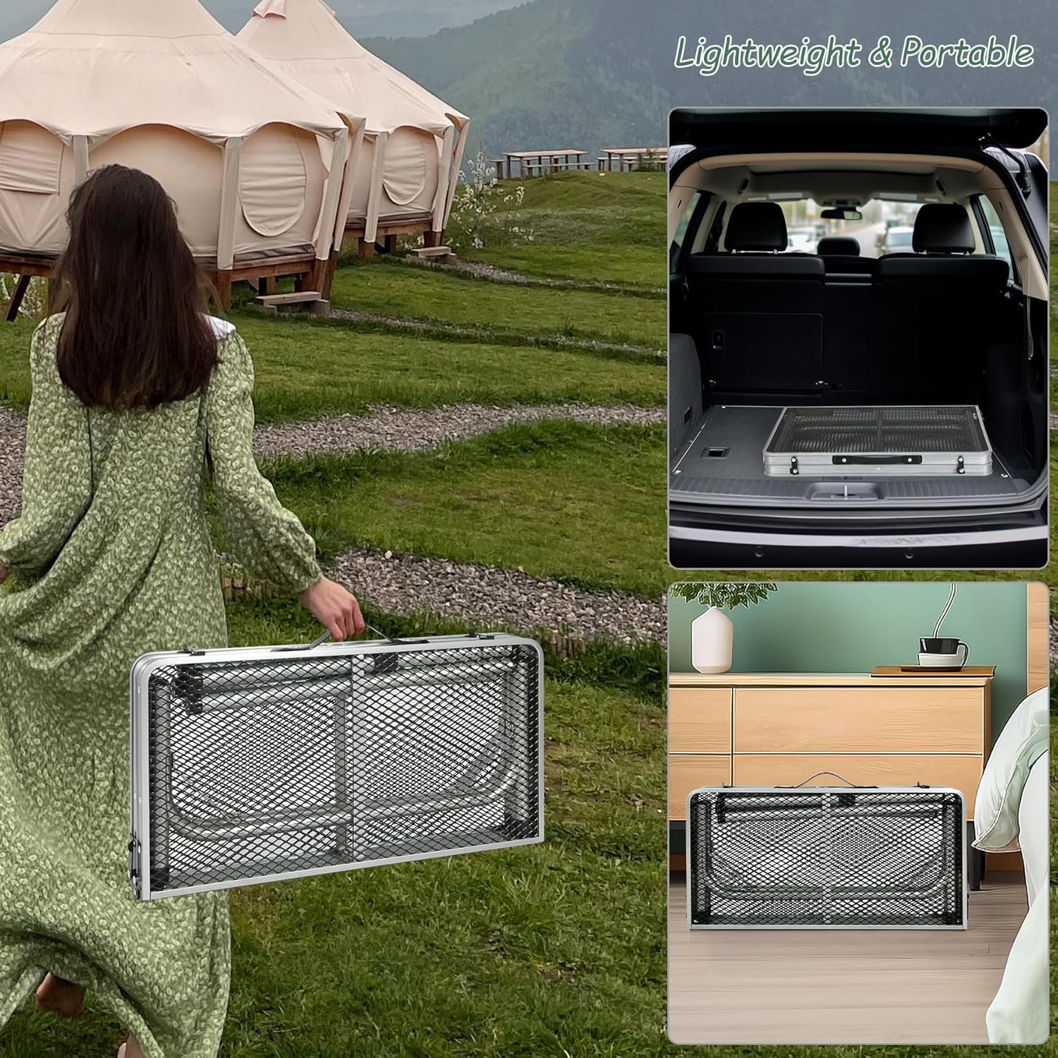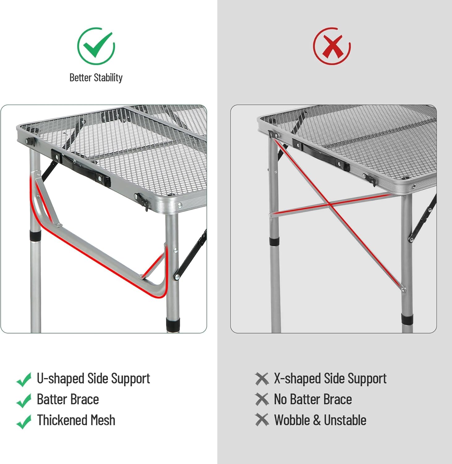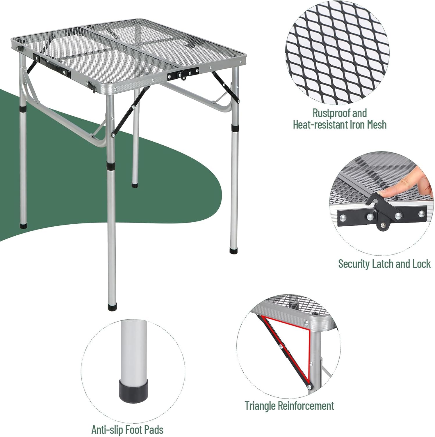 - [Premium Material&Design] This aluminum grill table is made of powder coating iron mesh (table top) and thicker aluminum alloy frame (Diameter 25mm). It also has X-shape side support and secure latch to ensure stable use.