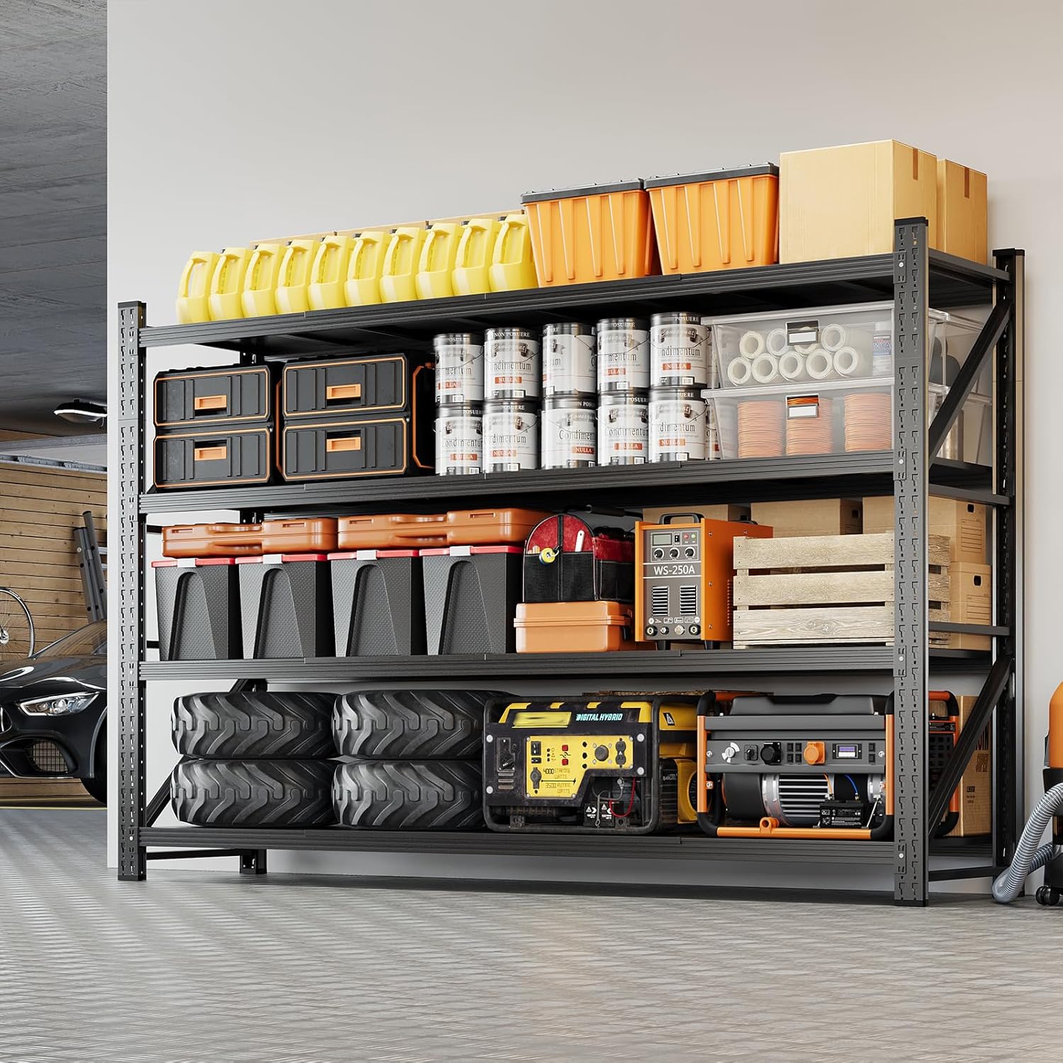 - ăAdjustable 4-Tier ShelvingăOur garage storage shelves are as flexible as your plans.This heavy duty shelving height of each layer could adjustable by moving the crossbar up or down,to meet the different heights of varied objects needed and customize your own space!