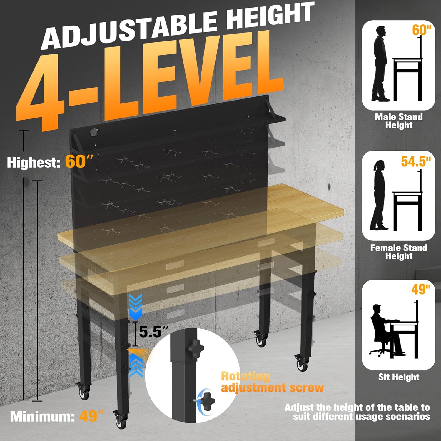 - Multi-Level Height Adjustable: Without additional tools, the workbench can be adjusted to 4 different heights from 39" to 60", allowing you to work more comfortably standing or sitting, preventing you from staying in the same position for a long time